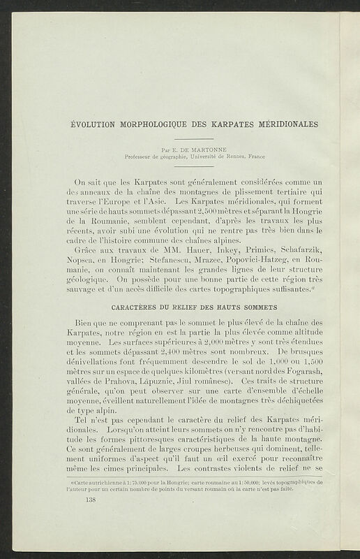 Evolution morphologique des Karpates méridionalesMartonne, Emmanuel de (1873-1955)