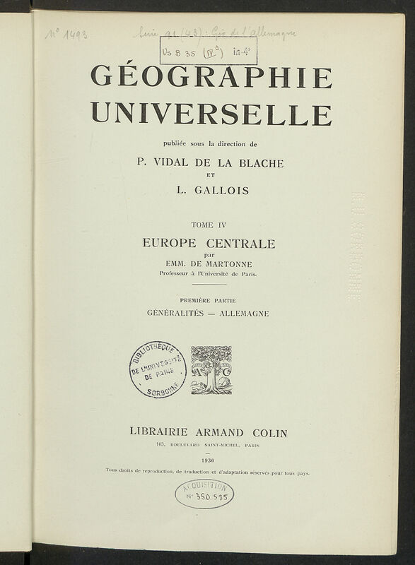 Géographie universelle. Tome IV, Europe centrale. Première partie, Généralités, AllemagneMartonne, Emmanuel de (1873-1955)