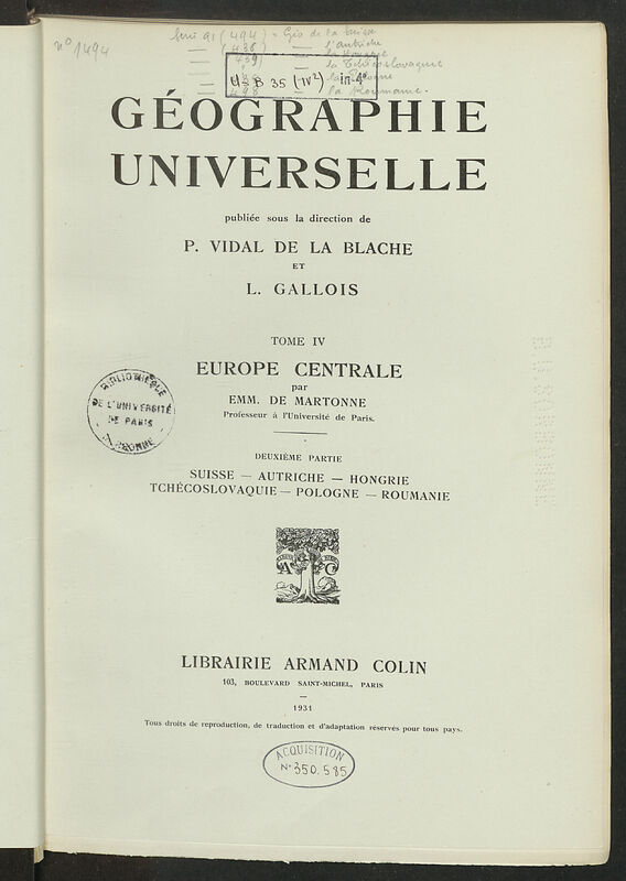 Géographie universelle. Tome IV, Europe centrale. Deuxième partie, Suisse, Autriche, Hongrie, Tchécoslovaquie, Pologne, RoumanieMartonne, Emmanuel de (1873-1955)