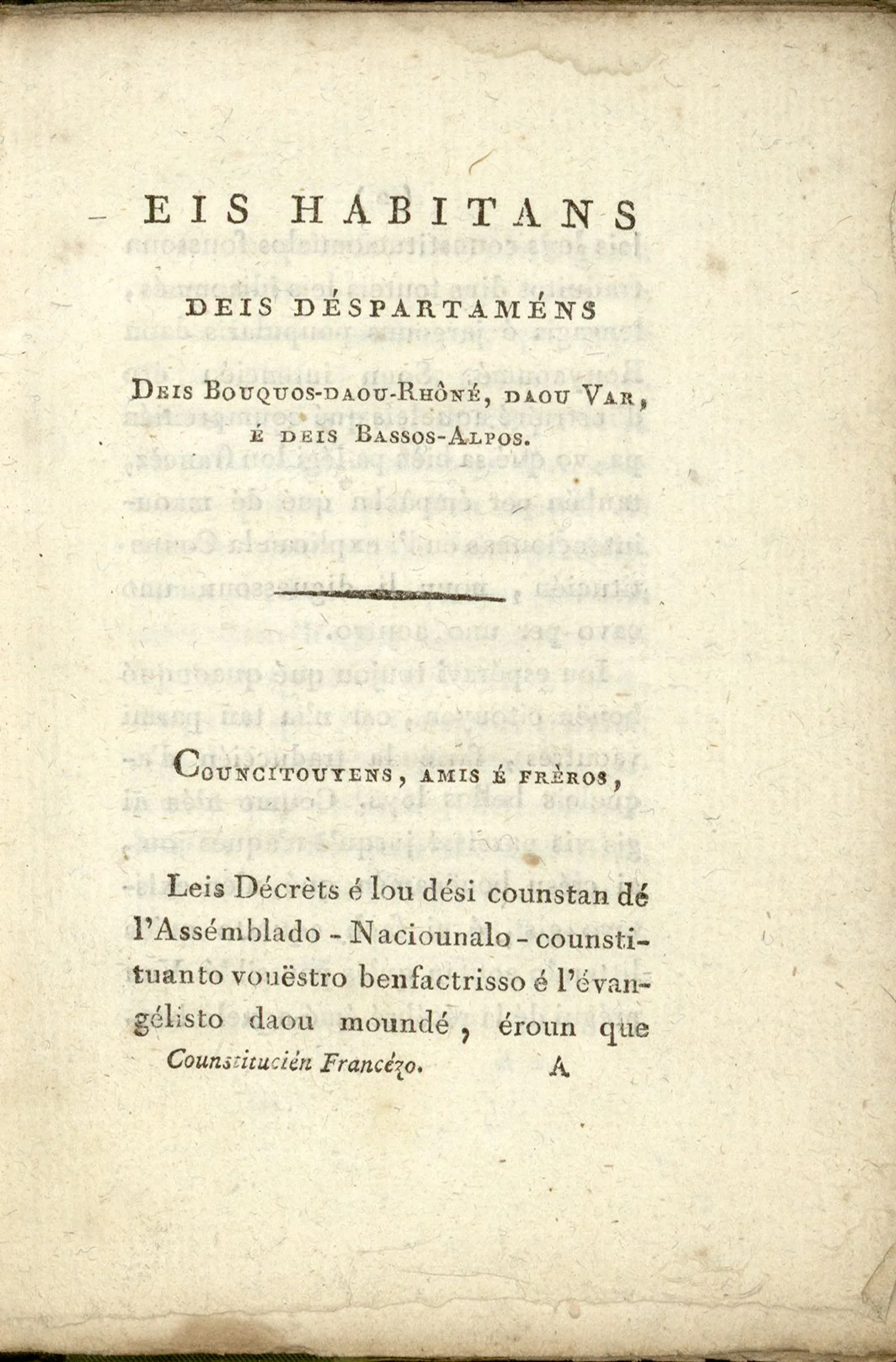En attendant, il convient de parer au plus pressé, c’est-à-dire faire en sorte que la loi soit comprise par tous. En janvier 1790, Adrien Duport, député de Paris, et François-Joseph Bouchette, député de Bailleul, soumettent à l’Assemblée nationale l’idée de publier les textes de lois en provinces dans des brochures bilingues. Plusieurs volontaires se présentent pour participer. C’est ici qu’entre en scène, parmi d’autres, Charles-François Bouche, député d’Aix-en-Provence aux côtés de Mirabeau, qui se charge de notre traduction en provençal.