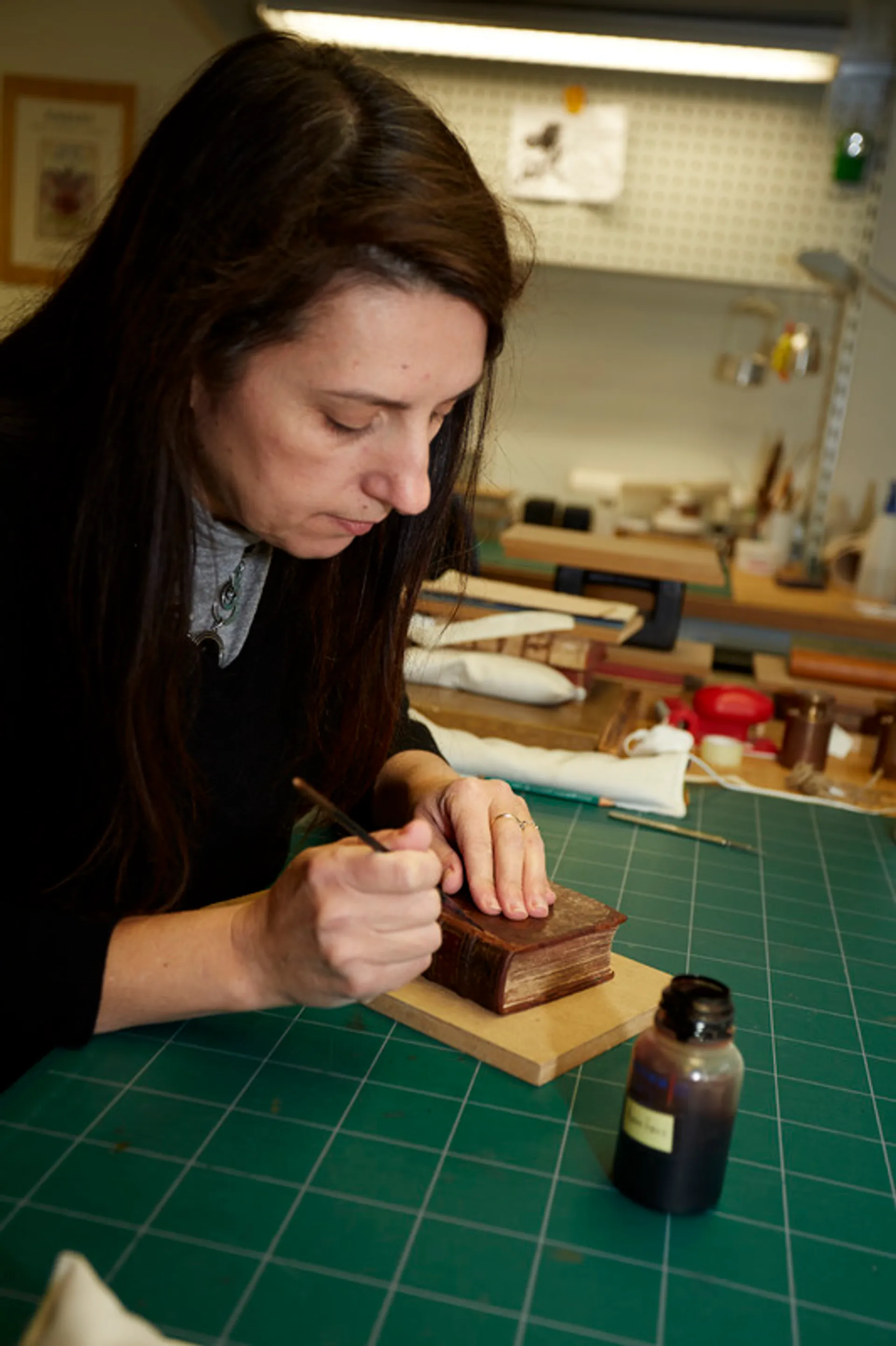 Au sein de l’atelier, on se réjouit du brassage des générations, des compétences et des points de vue apportés par les différents parcours, – mais on regrette aussi la disparition de l’ancienne voie, que les nouvelles ont supplanté plutôt que de venir s’y ajouter. Or, les formations longues tendent à être plus théoriques que pratiques. « D’où l’importance de conserver des ateliers dans les institutions et de ne pas tout externaliser, » commente Sylvie Struyve, responsable de l’atelier et de la conservation préventive des collections patrimoniales, qui a elle-même une formation de base en reliure complétée par un Master de l’Université Paris-1 ; « parce qu’aujourd’hui les institutions sont souvent les plus à même d’assurer une formation pratique, et que ce sont des espaces de transmission des connaissances et des compétences. C’est l’avantage de ne pas être dans une logique exclusivement économique. »