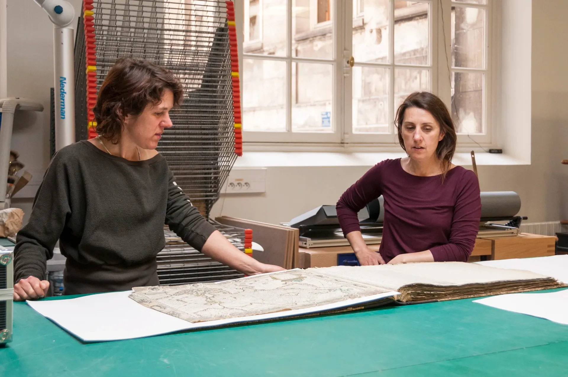 Dernière arrivée, Catherine Teixera, fraîchement diplômée de l’École de Condé, présente un type de parcours en train de devenir prédominant, avec une formation en cinq ans délivrée, soit par cet établissement privé, soit par l’Institut national du patrimoine (INP), soit enfin par l’Université Paris-1 Panthéon-Sorbonne et son Master Conservation-Restauration des Biens culturels (CRBC). Existent en outre de multiples formations à l’étranger, comme celle de l’École nationale supérieure des arts visuels de La Cambre, à Bruxelles. Installées depuis plus longtemps dans les murs et lauréates du concours de la filière des métiers d’art (Ministère de la culture), Gaëlle Füchs, Cécila Huteau et Anne-Laure Rogues de Fursac sont en revanches passés par des formations initiales en reliure (Brevet des métiers d’art de niveau Bac au lycée technique de Tolbiac et Diplôme des métiers d’art de niveau Bac+2 de l’école Estienne), complétées par une formation en restauration reçue dans les ateliers d’institutions publiques telles que la Bibliothèque nationales de France et les Archives nationales, à une époque où les formations actuelles n’existaient pas encore.