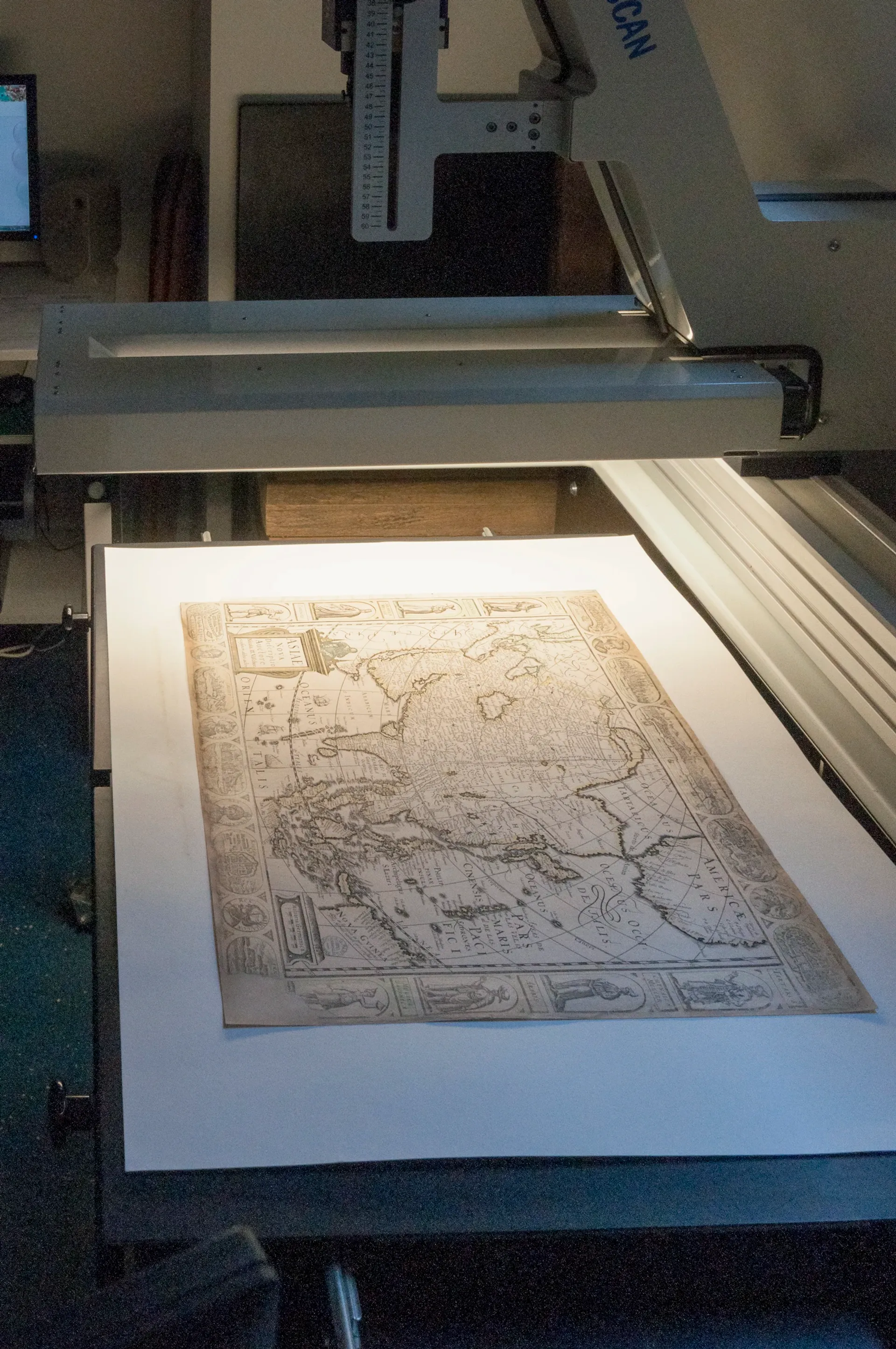 Attenant à l’atelier de restauration se trouve l’atelier de numérisation. Les documents à traiter y arrivent, accompagnés d’un bordereau détaillant les paramètres du travail à accomplir, par exemple la résolution d’image souhaitée (de 300 à 600 DPI selon la nature du document), et attirant éventuellement l’attention sur certaines caractéristiques matérielles du document, en particulier ses fragilités. Disposer d’un atelier de proximité permet une très grande réactivité dans les processus de réalisation, alors que les externalisations passent par des étapes parfois très lourdes : lorsqu’il faut les envoyer à des prestataires extérieurs, les documents précieux requièrent des constats d’état extrêmement précis au départ et au retour, opérations très chronophages. Le fait d’être sur place permet également d’alerter rapidement les conservatrices ou les restauratrices si un problème particulier est détecté. Il peut arriver que des demandes de numérisation soient refusées lorsque l’état du document ne se prête pas aux manipulations exigées par l’opération.