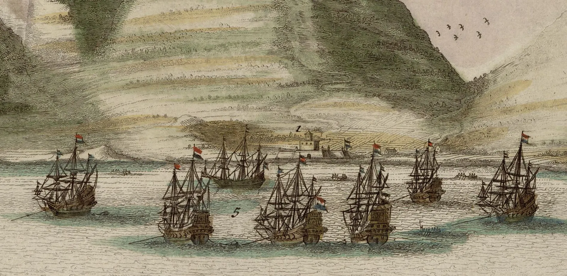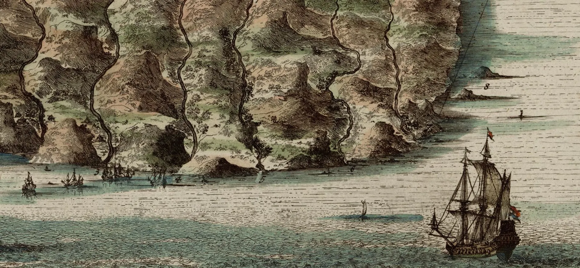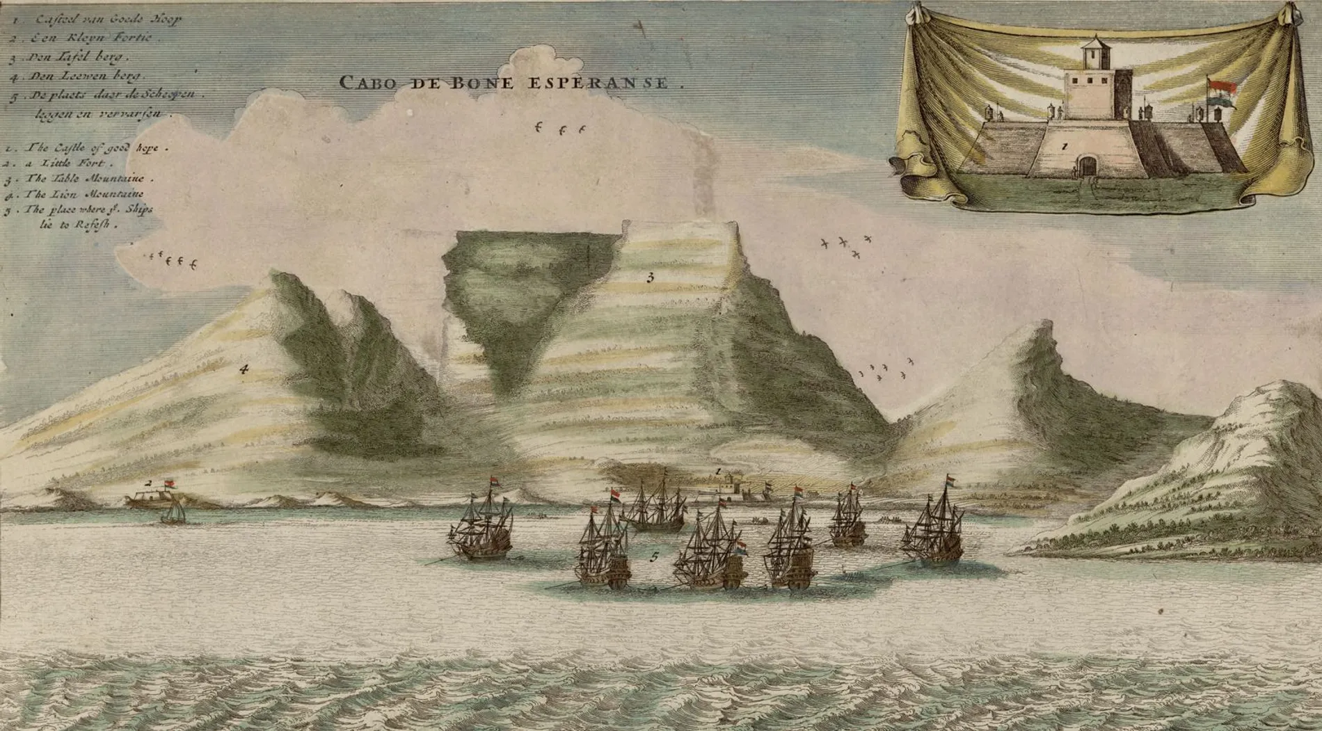 Cabo de Bone Esperanse, estampe gravée sur cuivre et coloriée à la main, R 2= 22. Pièce 23, NuBIS, détail.