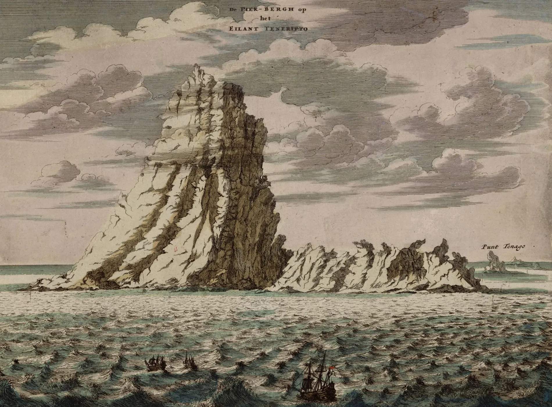De piek-bergh op het eilant Tenerifto, estampe gravée sur cuivre et coloriée à la main, R 2= 22. Pièce 26, NuBIS, détail.