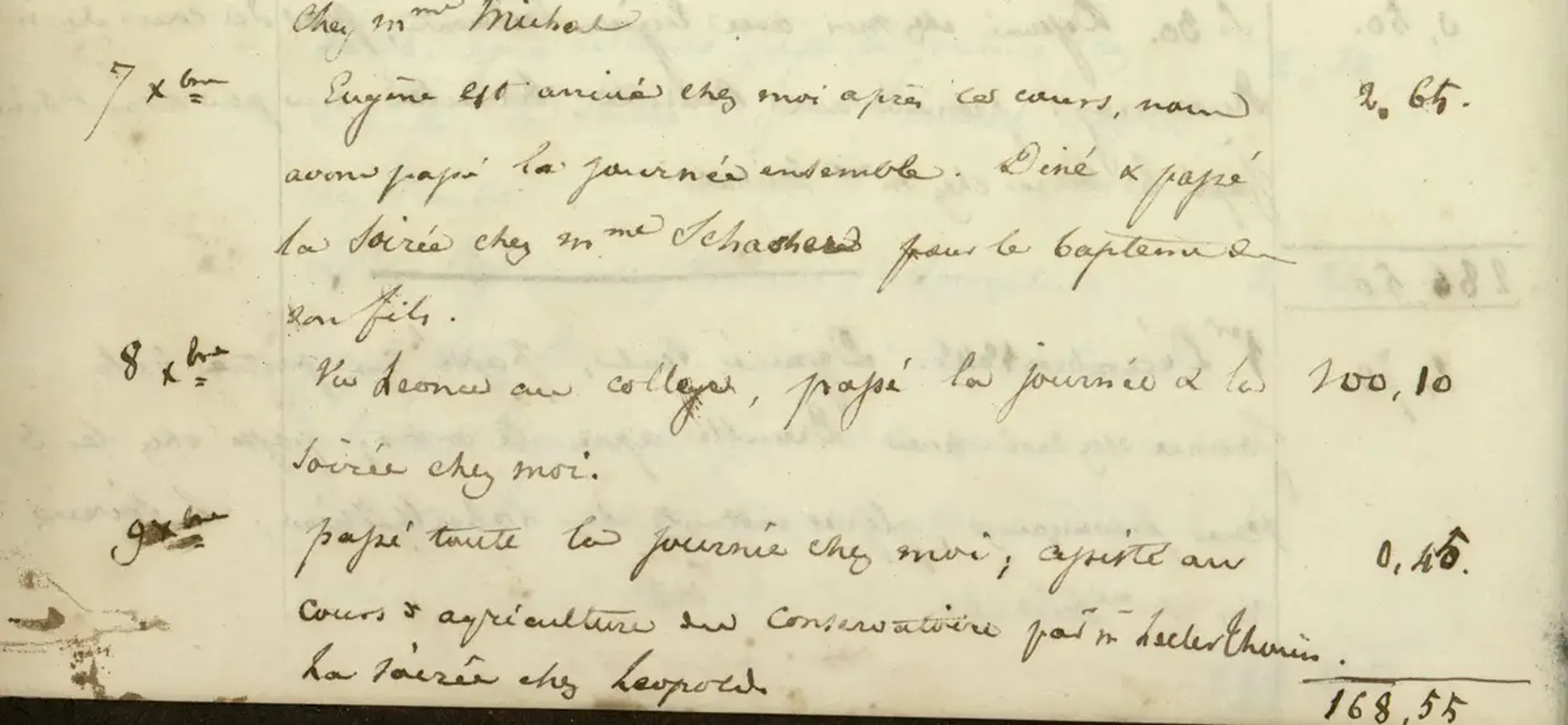 Figure 2 : La date dans la colonne de gauche, le texte au milieu, les comptes à droite avec le total à chaque fin de page. Journal de ma vie d’étudiant à Paris, BIS, MS 2627. En ligne sur NuBIS.