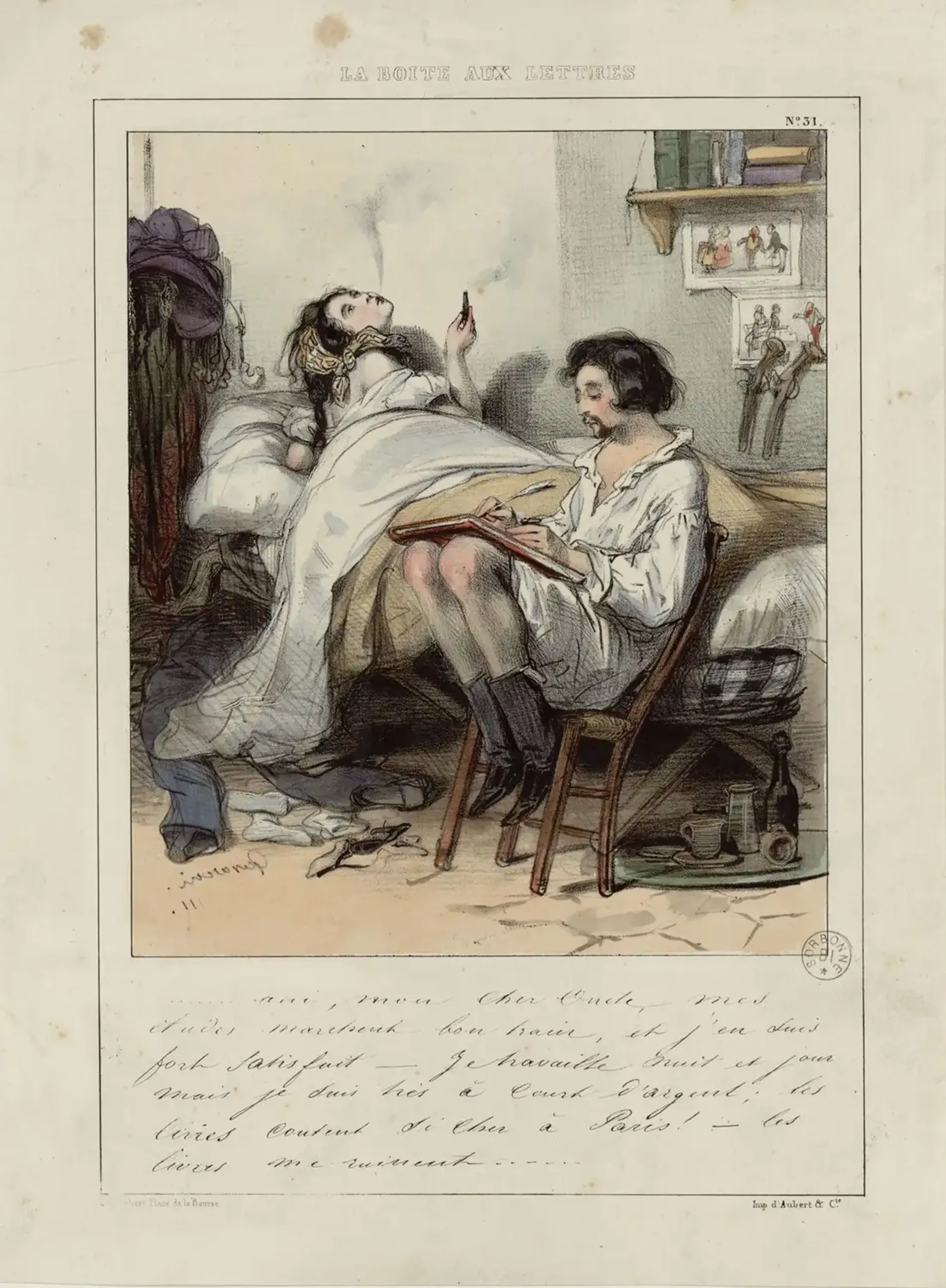Figure 3 : « La boîte aux lettres » (1837-1838) de Paul Gavarni, ayant pour légende « Oui, mon cher oncle, mes études marchent bon train et j’en suis fort satisfait. Je travaille nuit et jour mais je suis très court d’argent ; les livres coutent si cher à Paris ! Les livres me ruinent. ». BIS, ESTAMPE 83, pièce 1. En ligne sur NuBIS.