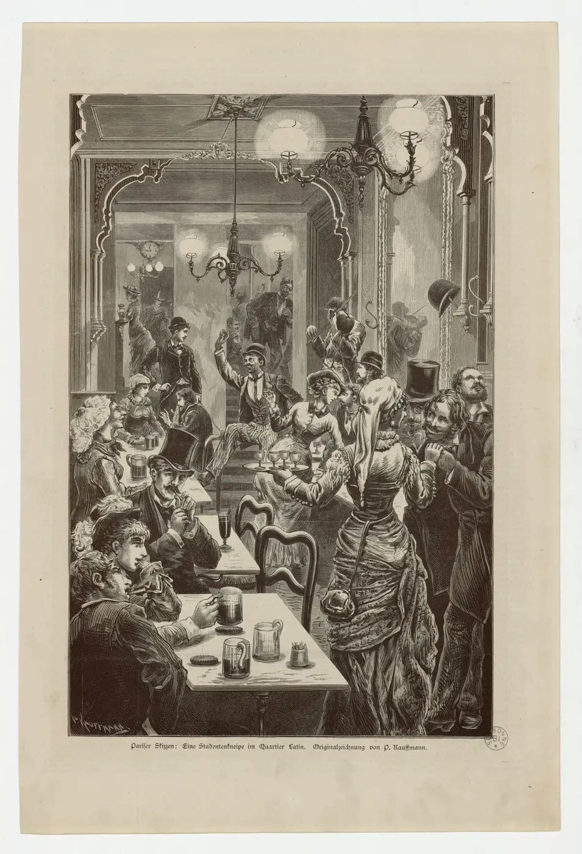Figure 5 : « Esquisses parisiennes : bar étudiant du quartier latin » (1880) de Paul-Adolphe Kauffmann. BIS, ESTAMPE 83, pièce 3. En ligne sur NuBIS.