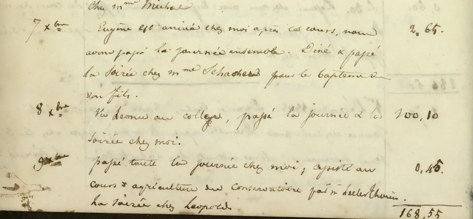 Il change cependant de pratique au cours de la seconde année de son journal : les descriptions se font plus longues, il exprime davantage son ressenti, notamment vis-à-vis de l’art ou de la nature, comme s’il s’appropriait enfin l’objet du journal. La colonne destinée à la comptabilité de l’étudiant disparaît alors, mais le souci de l’argent demeure, comme le démontrent les fréquentes mentions d’envois d’argent de la famille.