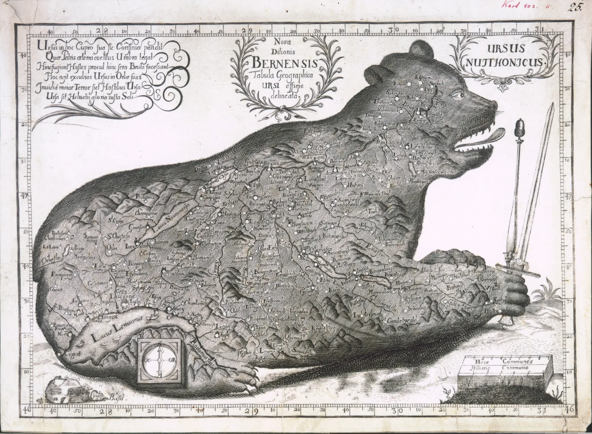 Jakob Störcklein, Nova ditionis Bernensis tabula geographica ursi effigie delineata, Helvetia occidentalis - südwestlicher Teil (Bern, Oberland, Fryburg, Lemann, Wallis): Sammelband der Ryhiner-Kartensammlung, Bâle, vers 1700. Universitätsbibliothek Bern, MUE Ryh 3211 : 25 A. En ligne sur e-rara.
