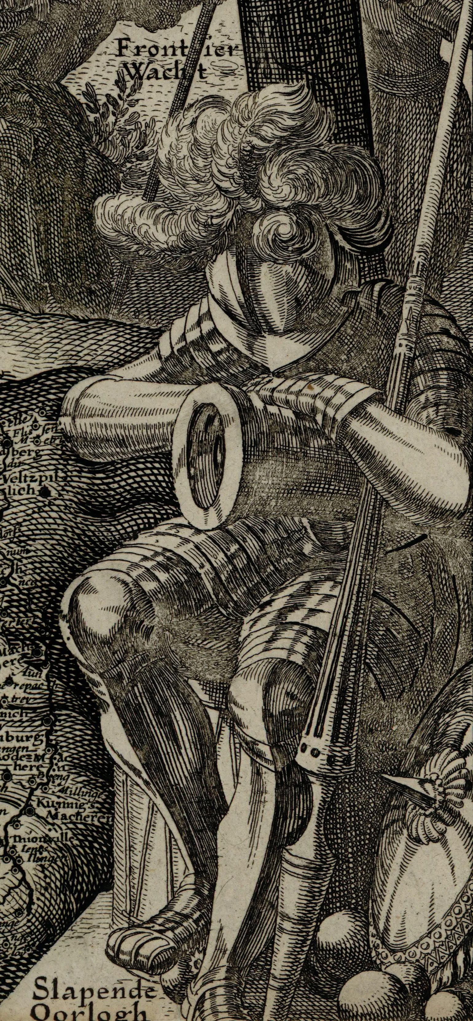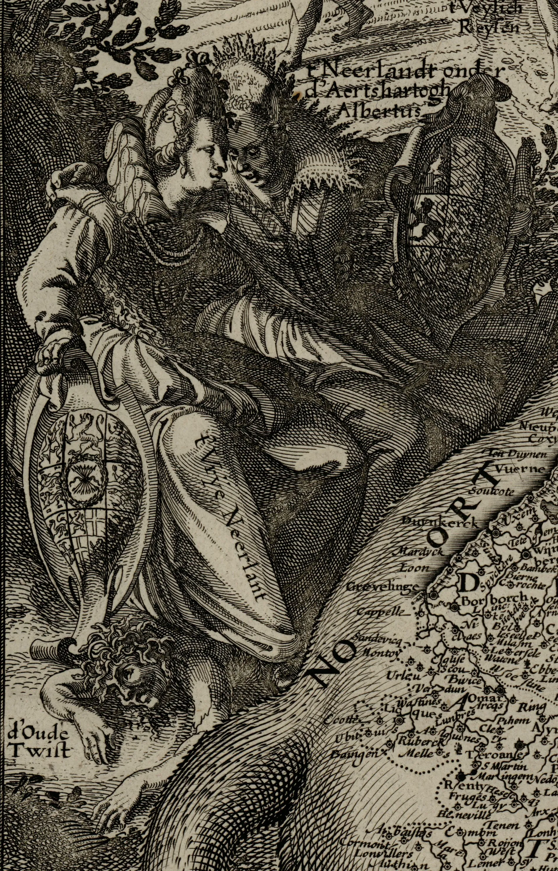 Le lion est par ailleurs entouré de symboles de paix et de prospérité : en arrière-plan, des paysans réalisent les moissons, des troupeaux paissent dans les champs, des marchandises sont chargées sur des bateaux, une cité est en cours de construction. Depuis les nuées, un ange laisse tomber divers objets symbolisant les arts et les sciences, la sécurité, la maîtrise du temps, la richesse et la bénédiction. Au-dessus de cet ange apparaît le nom de Dieu (« God ») au cœur d’un soleil dont les rayons dissipent les nuages. Les Pays-Bas apparaissent ainsi sous la protection divine, grâce à laquelle ils bénéficient des nombreux bienfaits de la trêve. À la droite du lion, un personnage en armure complète, représentant la guerre, est en train de dormir (« Slapende Oorlogh »), symbolisant ainsi l’arrêt du conflit. À la gauche du lion, deux figures féminines sont assises côte-à-côte et conversent, l’une passant le bras sur l’épaule de l’autre : elles symbolisent les deux parties des Pays-Bas, celle fidèle aux Habsbourg et celle revendiquant son indépendance, temporairement réconciliées. De leurs pieds, elles écrasent un personnage représentant l’ancienne discorde (« d’oude twist »). La carte est surmontée par les armoiries des dix-sept provinces et encadrée à droite et à gauche par deux séries de vignettes représentant des vues des principales villes des Pays-Bas. Cette représentation acte cependant la division entre les cités du nord relevant des Provinces-Unies (représentées à gauche, en commençant par Amsterdam) et celles du sud relevant du gouvernement des Habsbourg (représentées à droite, Anvers en tête). Si cette carte recouvre une dimension très symbolique, il est cependant important de souligner la qualité du travail cartographique réalisé : la description topographique et toponymique des Pays-Bas représentés dans les contours du lion est très précise et soignée.