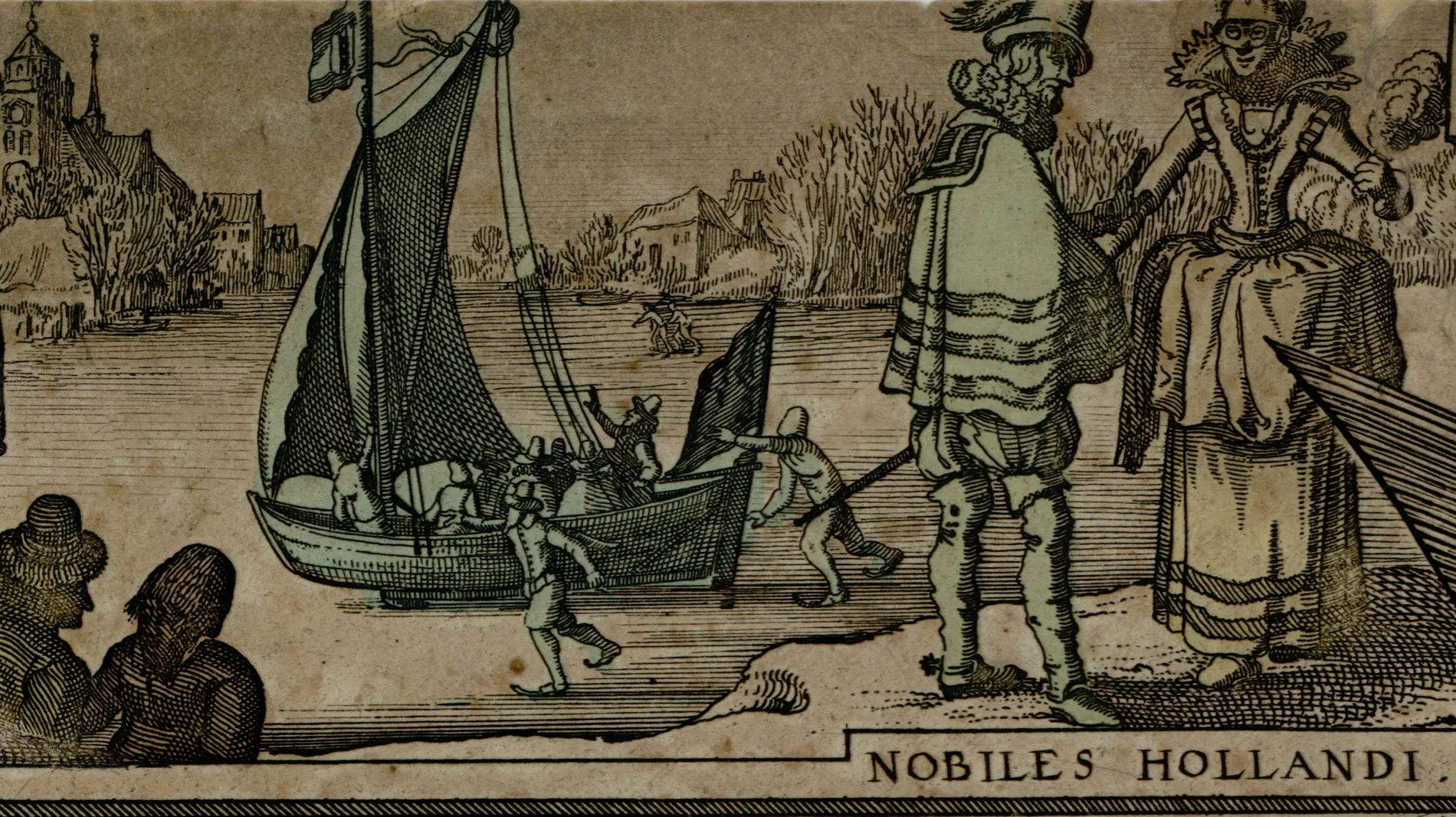 Détail de la bordure supérieure : des nobles conversant au premier plan et des personnages montant dans une barque à voile à l’arrière-plan.