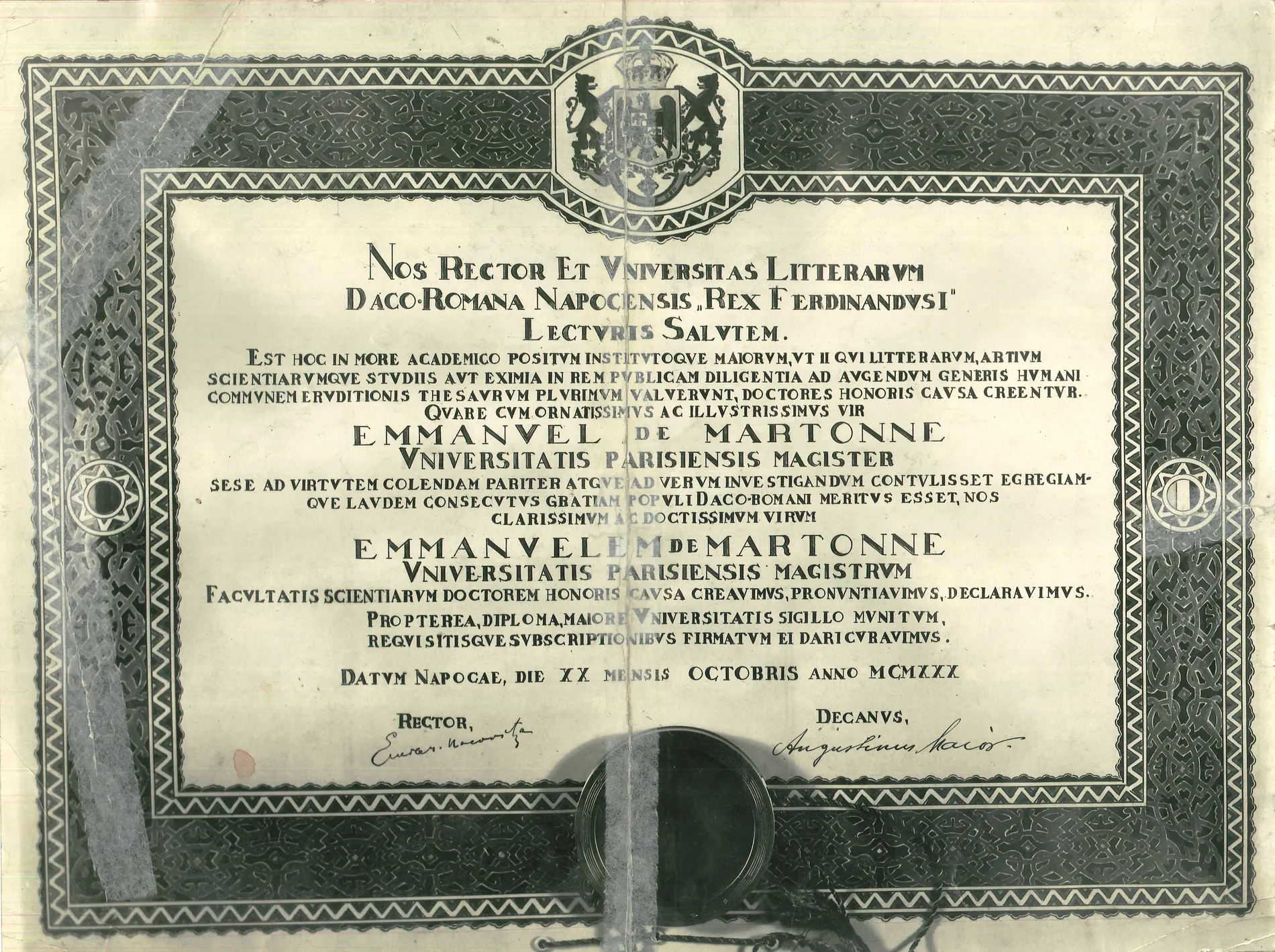 Diplôme de Docteur honoris causa remis à E. de Martonne par l’Université de Cluj en octobre 1930. [Source : Musée d’histoire de l’Université Babes-Bolyai, Cluj-Napoca, Roumanie.]