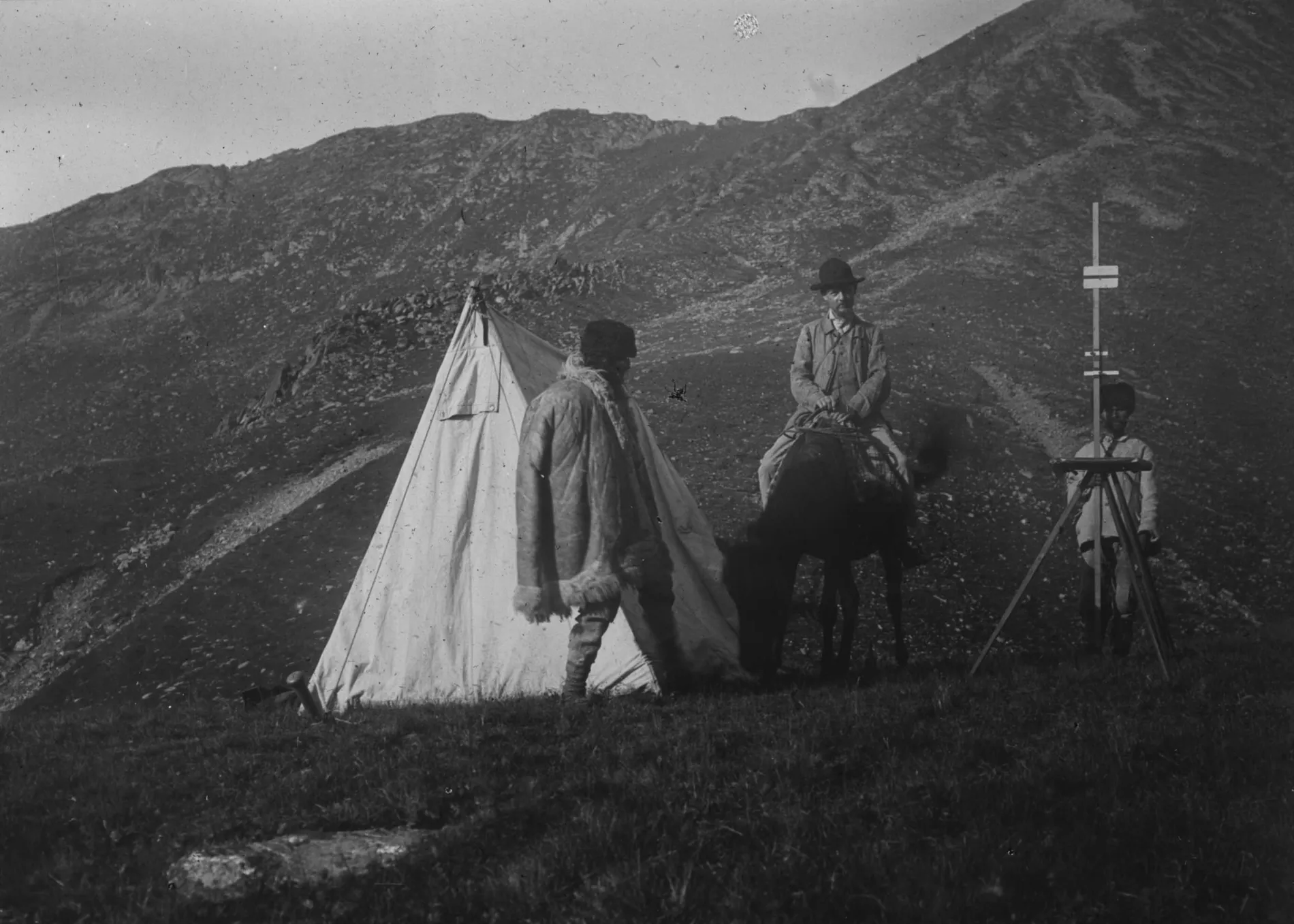 E. de Martonne à cheval sur son terrain de thèse en Roumanie. Plaque de verre intitulée « Paringu, campement dans la montagne », 1903, cotée eu3554(035), CNRS, UMR PRODIG.