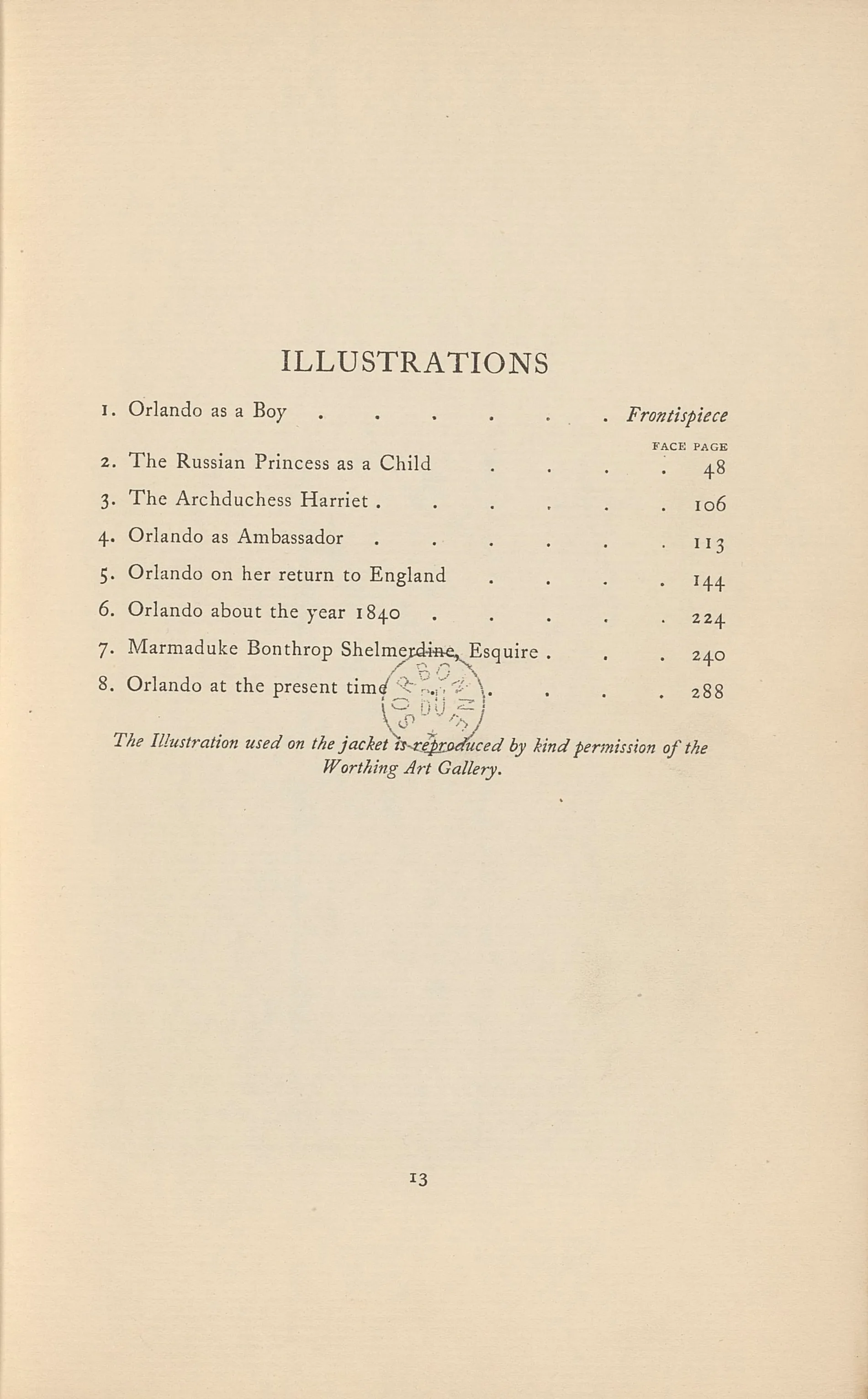Fig. 2. Table des Illustrations, Orlando: a biography, Virgnia Woolf, London, Hogarth Press, 1928. BIS, R 8= 2526. En ligne sur NuBIS.