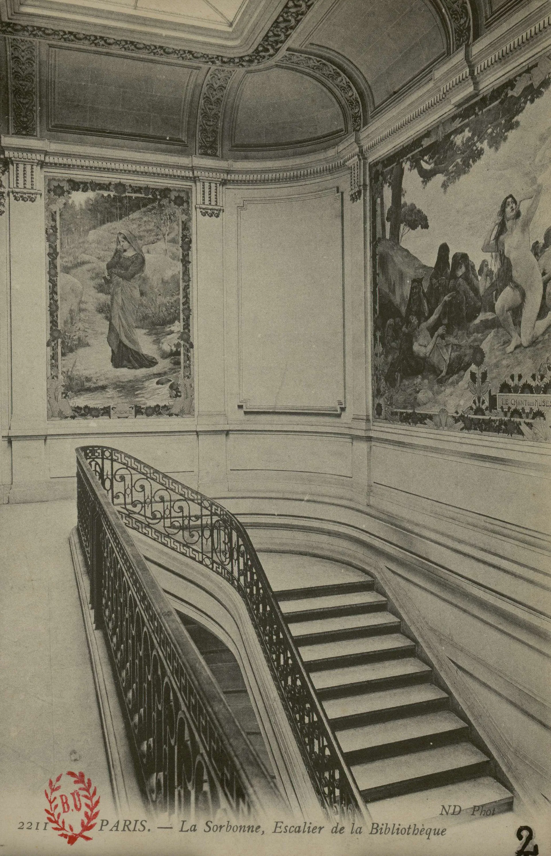Enfin, Rochegrosse exécute un autre décor peint, certainement le plus vu de tous : Le Chant des muses éveille l’âme humaine (1898) qui, accompagné de deux peintures latérales, La Science et Le Rêve, orne toujours l’escalier de l’ancienne entrée de la Bibliothèque interuniversitaire de la Sorbonne, appelée Bibliothèque de l’Université de Paris au moment de la réalisation de l’œuvre (Fig. 10).
