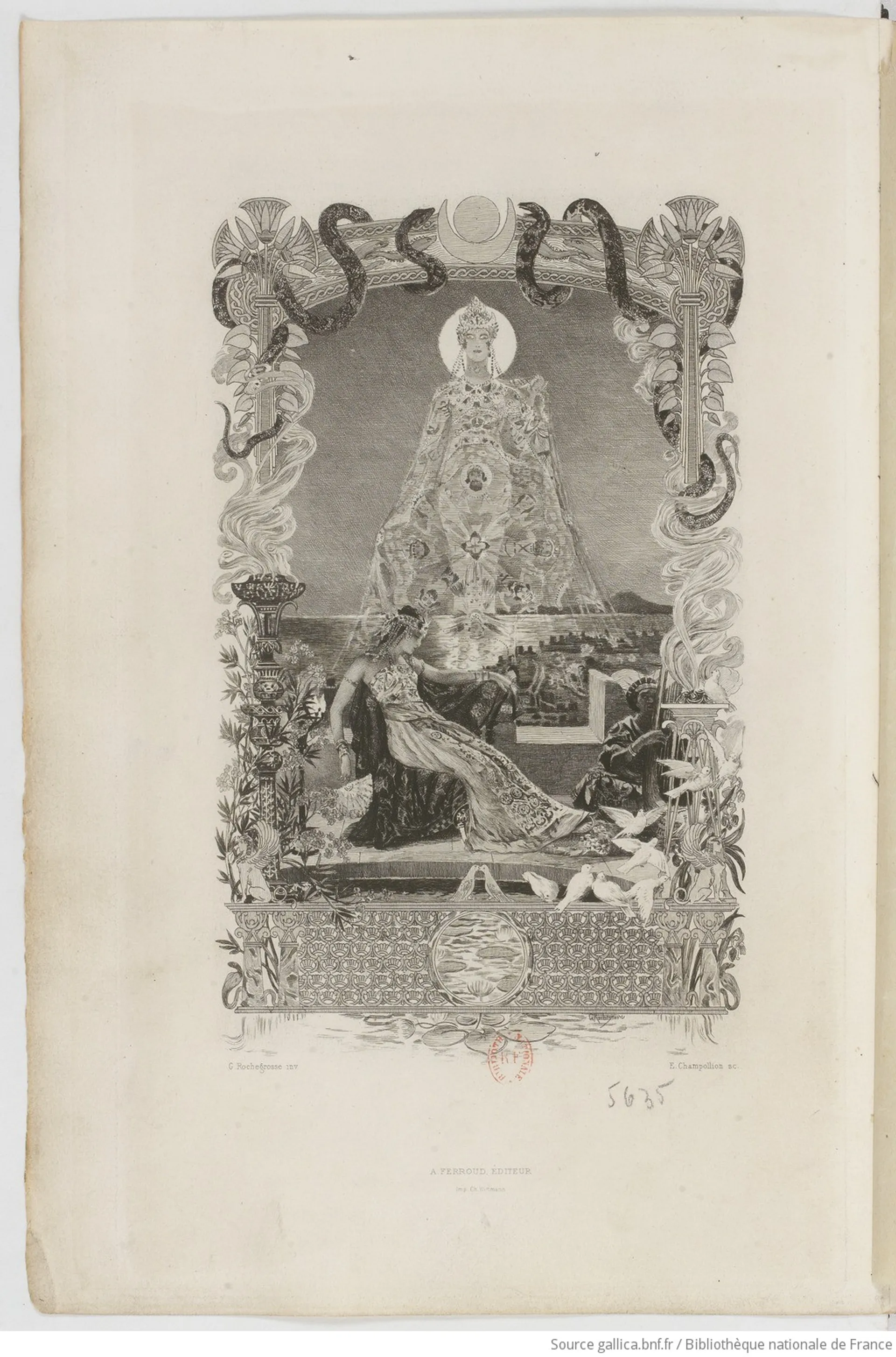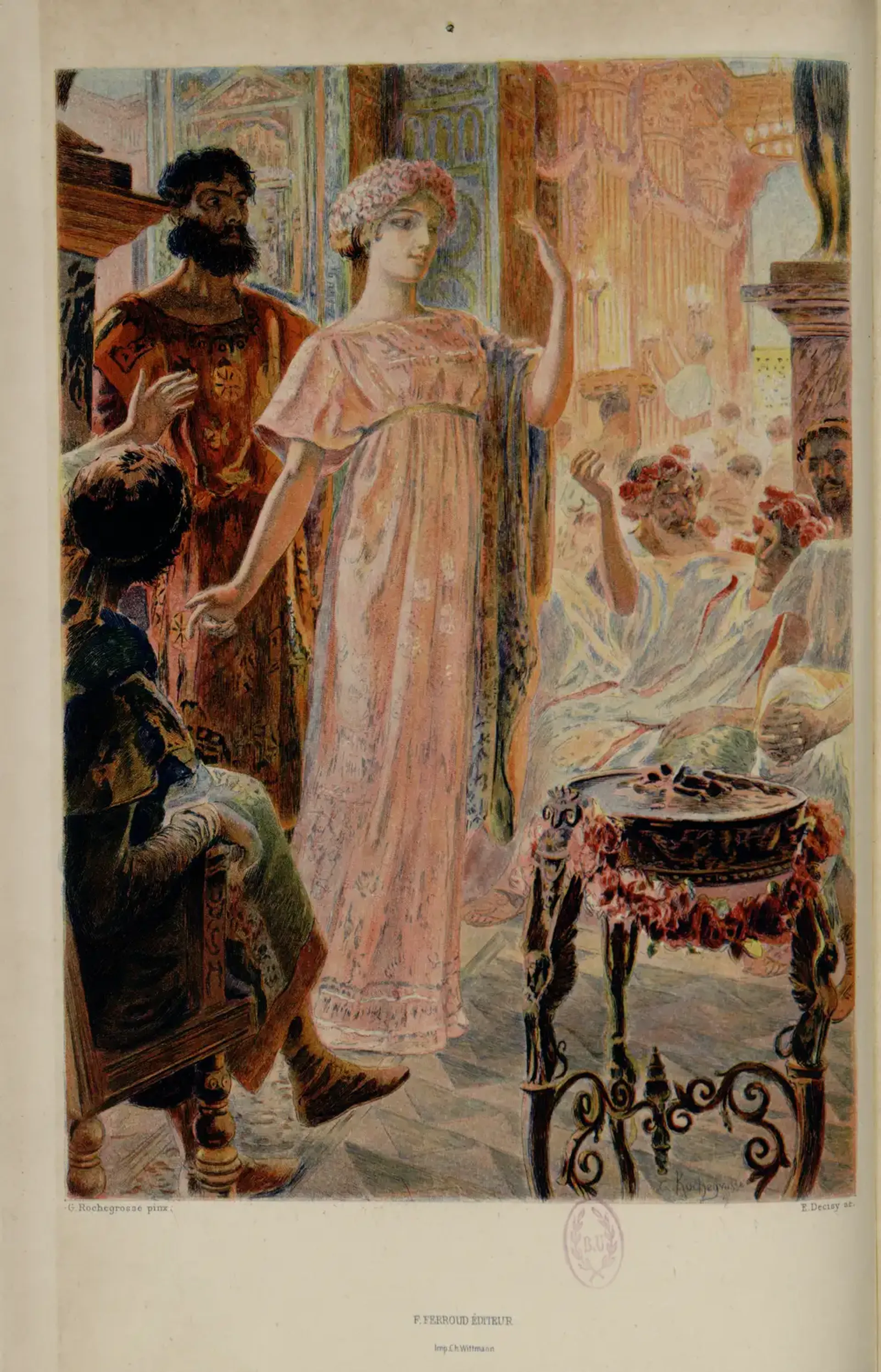 C’est par ces mots que l’écrivain et critique d’art Camille Mauclair conclut la lettre-préface à son roman Le poison des pierreries illustré par Georges-Antoine Rochegrosse (1859-1938) et publié chez Ferroud en 1903. Les œuvres littéraires empreintes de mysticisme et d’orientalisme, décrivant un passé lointain et des figures mythologiques, ont beaucoup inspiré Georges-Antoine Rochegrosse, peintre et illustrateur célèbre dans les salons de la fin du XIXe siècle, mais aujourd’hui méconnu. On lui doit notamment les décors peints du grand escalier par lequel des générations entières ont accédé, avant 2013, à la bibliothèque interuniversitaire de la Sorbonne — et qui sont toujours visibles aujourd’hui dans ses locaux.