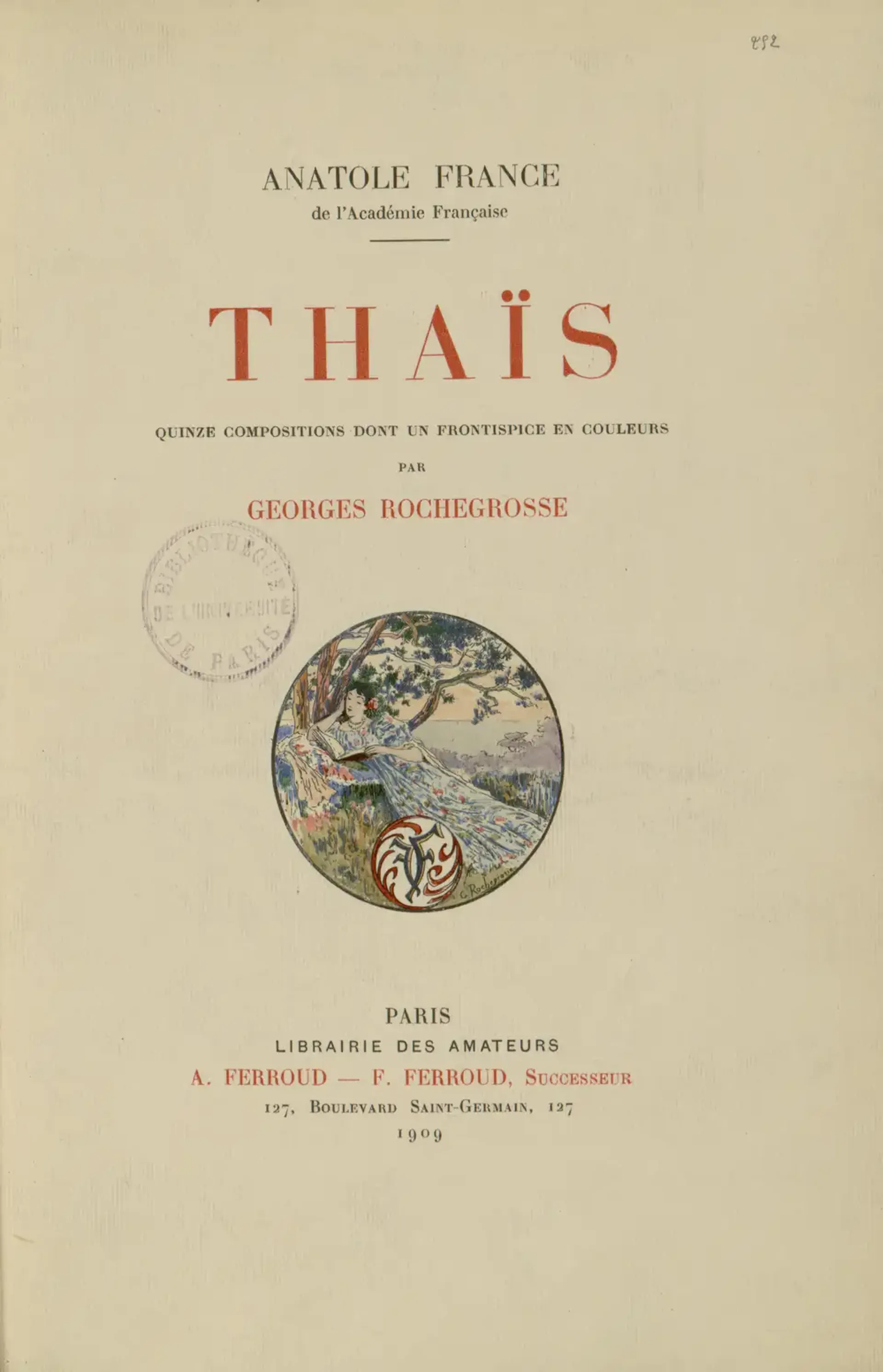 Parmi ses multiples livres illustrés, la Bibliothèque interuniversitaire de la Sorbonne conserve un exemplaire de Thaïs, le roman d’Anatole France, accompagné de 15 compositions, dont un frontispice en couleurs (Paris, Librairie des amateurs A. Ferroud - F. Ferroud, successeur, 1909. BIS, Réserve, RRA 8= 394, Fig. 8-9).
