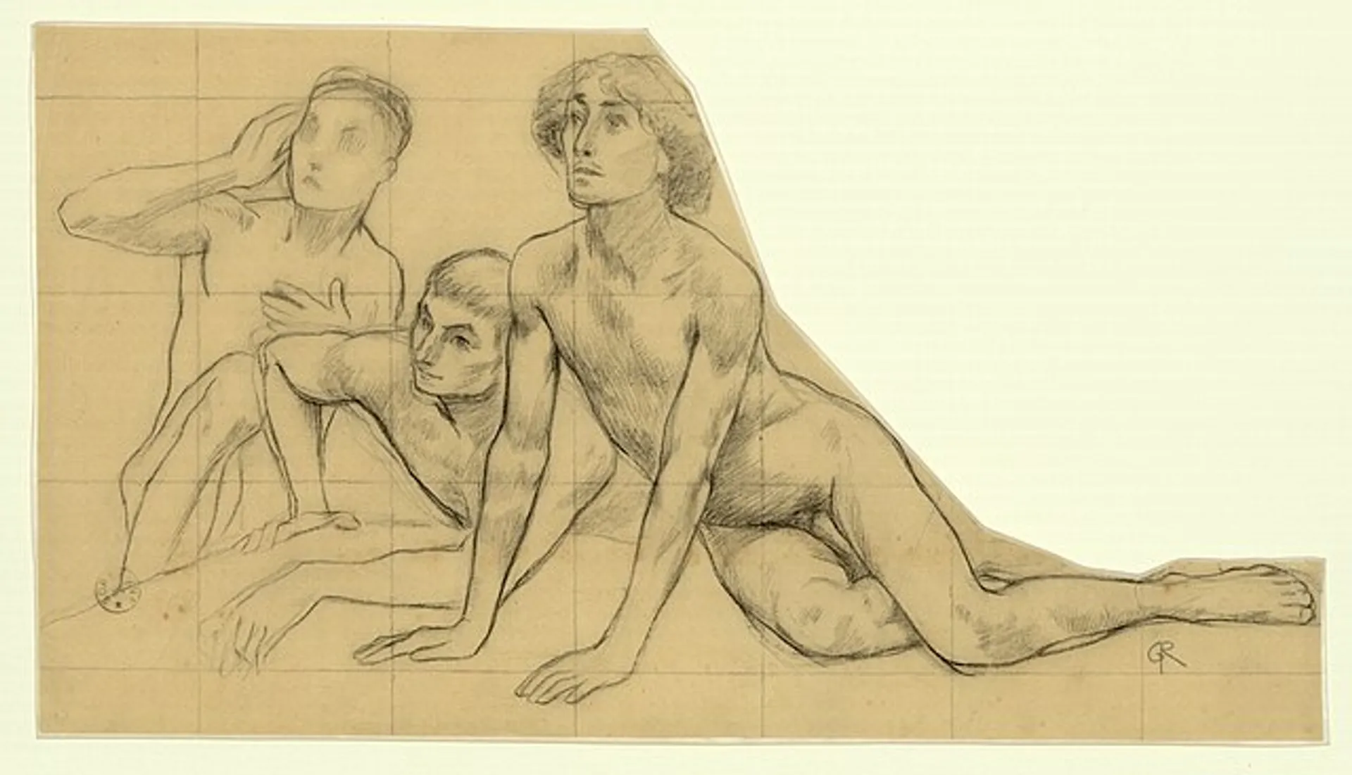 Les poses des croquis diffèrent légèrement de celles de l’œuvre finale : seul le jeune homme qui s’appuie sur ses bras sur l’esquisse centrale est tout de suite reconnaissable. Cependant, l’intention générale est déjà assez claire dans ces esquisses : c’est le mouvement des personnages qui mène l’œil du spectateur vers le point focal de la peinture où règnent les muses impassibles, par contraste avec les humains tourmentés. On remarque également un élan spirituel : les regards et les gestes sont aspirés vers le haut, vers l’espoir et (implicitement) vers les arts.