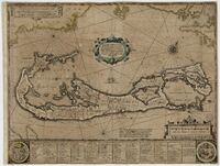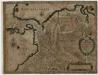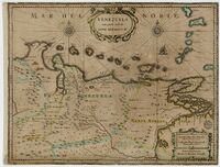 Mention des graveurs : Sculpserunt E. S. Hamers-veldt et S. Rogeri. Daté à partir de 1630. Publié dans : Atlantis majoris appendix en 1630. Sans texte au verso. Titre et échelle dans 2 cartouches ornementaux. Contours coloriés. Deux roses des vents, lignes de rhumbs. Longitude et latitude. Relief, cours d'eau, bancs, villes et colonies. Notes manuscrites sur la carte. Échelle graphique : 25 milliaria Grmanica communia = 5,8 cm ; 35 milliaria Gllica communia = 6,2 cm ; [ca 1:3 171 000]. Échelle calculée à partir de la longueur d'un degré de latitude : 1° de latitude = 3,5 cm (1° de latitude = 11 100 000 cm). Coordonnées géographiques : W 73°22' - W 59°16' / N 15°41' - N 6°16'. Dans un recueil factice en 4 volumes, dont le 1er est précédé d'un titre manuscrit dans un encadrement gravé : "Atlas ou recueil des cartes geographiques des quatre parties du monde. De la biblioteque de M.r Philippe Despont prestre docteur en theologie". Note manuscrite dans l'encadrement du titre : "Attaché dans ce portefeuille pendant l'année 1670". -
