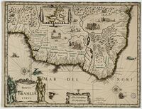 Publié par Blaeu dans son Atlantis Appendix en 1630 et 1631. Sans texte au verso. Titre et échelle dans un cartouche ornemental. Rose des vents et rhumbs. Bordures coloriées. Navires à voiles, chaînes de montagnes, cours d'eau, lacs, villes, colonies, toponymie côtière. Orienté le Nord à gauche. Échelle graphique : 100 miliaria Germanica communia = 11,2 cm ; 140 miliaria Gallica communia = 11,7 cm. Échelle calculée à partir de la longueur d'un degré de latitude : 1° de latitude = 1,7 cm (1° de latitude = 11 100 000 cm). Échelle numérique : [ca 1:6 529 000]. Coordonnées géographiques : W 81°44' - W 65°17' / N 3°13' - S 24°23'. -