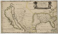 Basé sur la carte d'Ortelius avec les mêmes textes explicatifs, "Hispaniae novae sivæ magnae, recens et vera descriptio. 1579". Publié dans le Novus Atlas vers 1635. Sans texte au verso. Titre dans un cartouche orné des armoiries de l'Espagne. Notes explicatives dans un cartouche entouré d'angelots et tatous. Bordures coloriées. Rose des vents et rhumbs. Textes explicatifs, légende, navires à voiles, relief, cours d'eau, lacs, villes, colonies Échelle graphique : 15 milliaria hispanica = 4,7 cm. Échelle calculée à partir de la longueur d'un degré de latitude : 1° de latitude = 5,5 cm (1° de latitude = 11 100 000 cm). Échelle numérique : [ca 1:2 018 000]. Coordonnées géographiques : W 106°40' - W 98°31' / N 24°05' - N 18°00'. Dans un recueil factice en 4 volumes, dont le 1er est précédé d'un titre manuscrit dans un encadrement gravé : "Atlas ou recueil des cartes geographiques des quatre parties du monde. De la biblioteque de M.r Philippe Despont prestre docteur en theologie". Note manuscrite dans l'encadrement du titre : "Attaché dans ce portefeuille pendant l'année 1670". -