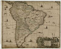 Publié dans l'Atlantis appendix et l'Atlas novus de Blaeu à partir de 1630. Sans texte au verso. Titre et échelle dans 2 cartouches ornementaux. Adresse dans un cartouche décoré d'une sphère armillaire. Deux roses des vents et rhumbs, latitude, navires à voiles, baleines, relief, cours d'eau. Contours coloriés, légende sur une banderole, colonies, toponymie côtière. Orienté nord vers l'ouest. Notes manuscrites sur la carte. Échelle graphique : 100 milliaria gallica communia = 10,8 cm ; 80 leucae hispanicæ = 9,8 cm ; et 70 milliaria germanica communia = 10,1 cm ; [ca 1:5 286 000]. Échelle calculée à partir de la longueur d'un degré de latitude : 1° de latitude = 2,1 cm (1° de latitude = 11 100 000 cm). Coordonnées géographiques : W 77°10' - W 61°52' / S 18°01' - S 38°42'. Dans un recueil factice en 4 volumes, dont le 1er est précédé d'un titre manuscrit dans un encadrement gravé : "Atlas ou recueil des cartes geographiques des quatre parties du monde. De la biblioteque de M.r Philippe Despont prestre docteur en theologie". Note manuscrite dans l'encadrement du titre : "Attaché dans ce portefeuille pendant l'année 1670". -