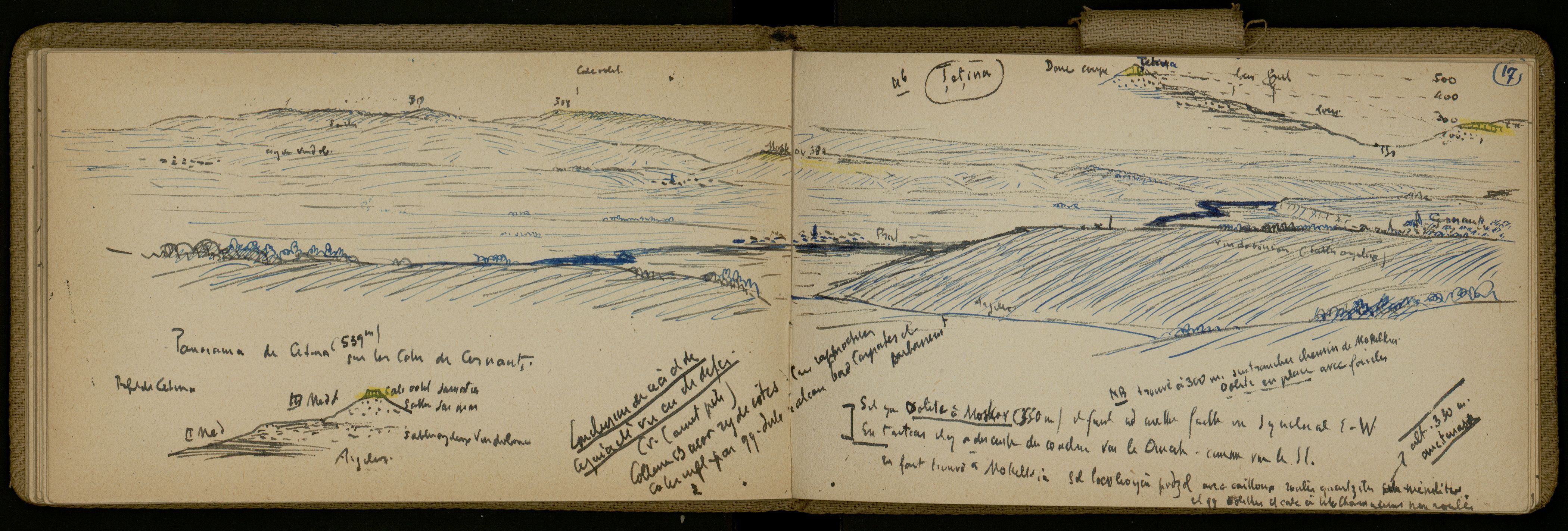 On constate que le croquis du carnet [16] a été repris dans la publication des résultats scientifiques de l'expédition quasiment à l'identique : la seule différence réside en l'absence des brèves indications inscrites, dans la version publiée, signalant des repères géologiques (t pour Trias) et des repères de surfaces d’érosion (II).