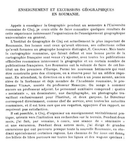 Emmanuel de Martonne, "Enseignement et excursions géographiques en Roumanie [compte-rendu]", Annales de Géographie, 1922.