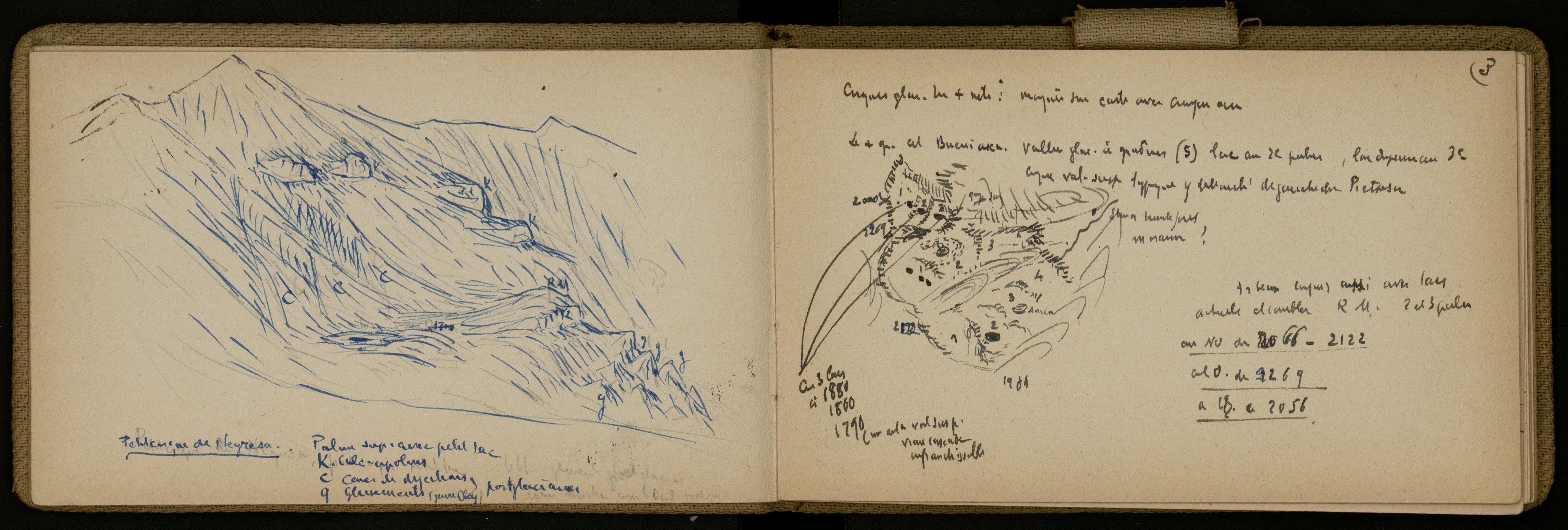 Le dessin paysager intitulé « Petit cirque de Negresa » donne une impressions de relief et de pente, avec des repères alphabétique en séries (« ccc, kkk, ggg ») et des indication altitudinale (1700 m). On note qu'E. de Martonne a d’abord écrit et dessiné au fusain avant de repasser le tout au stylo bleu. Le texte expose de façon concise le raisonnement géomorphologique en trois temps : la description topographique ( « Palier sup[érieur] avec petit lac »), puis l’analyse géologique (K calc[aires] cipolins) et enfin la synthèse géomorphologique qui caractérise les formes du relief terrestre et les processus qui y ont conduit (« C Cônes de déjection » et «G Glissements postglaciaires (jeune clay) »).