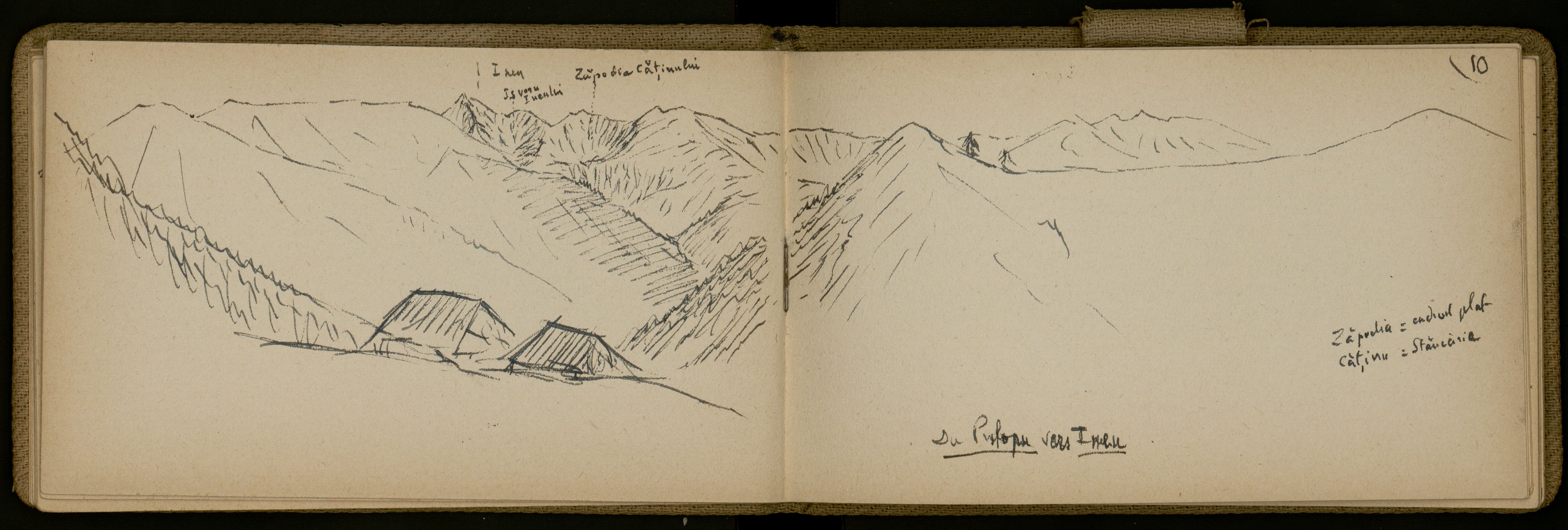 Cette double-page présente un dessin paysager intitulé « Du Prilopu vers Ineu ». Elle vise d’abord à livrer un panoramique du massif avec son modelé glaciaire, ses monts, ses pentes mais également à indiquer une présence et des activités humaines en esquissant les deux toits au premier plan : à cette altitude, il s’agit peut être d’un habitat temporaire de type bergerie pour une économie agro-sylvo-pastorale.