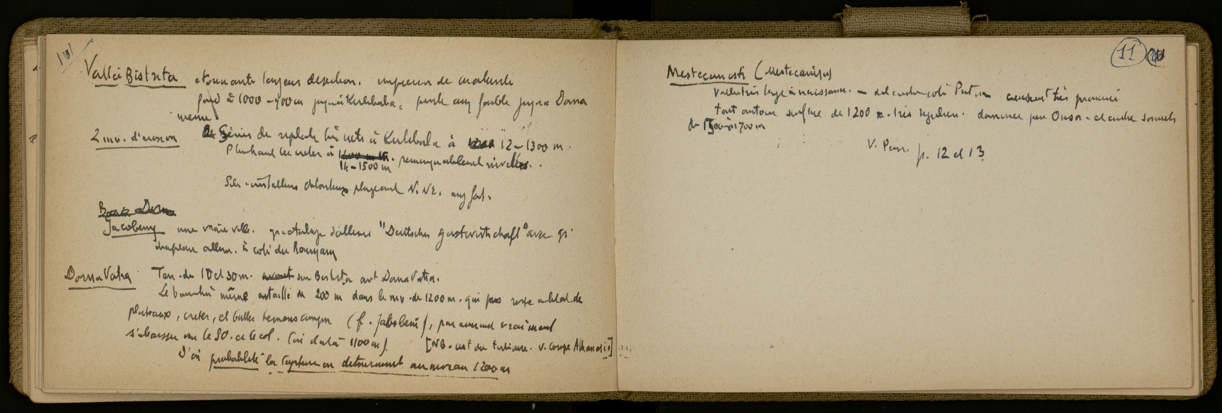 Cette double page présente un texte de synthèse sur les vallées de la Bistrita et de Mestecanesti au niveau du massif de Dorna Vatrae. Là encore, si le contenu du texte concerne pour les trois-quart la géomorphologie, le quart restant relève de la géographie humaine. En effet, E. de Martonne s’arrête sur la petite ville de Jacobeny dans la vallée de la Bistrita pour indiquer en style télégraphique : « Jacobeny : une vraie ville. Gr étalage d’allms. « Deutscher Gastwirtschaft » avec gr. Drapeau allemand à côté du roumain ». Cela signifie que E. de Martonne attribue à Jacobeny les caractéristiques, les fonctions et le rôle d’une ville. Il y note la présence bien visible de populations allemandes ; on peut penser que cette visibilité provient de ce qu’il entend (E. de Martonne parlant parfaitement allemand est capable de reconnaître cette langue dans la rue), de ce qu’il voit (par exemple des enseignes de commerce, voire des noms de rues en bilingue) et de ce qu’il goûte (il précise qu’avec son groupe d’excursionnistes, ils sont allés se sustenter dans une auberge allemande). Il est de plus sensible aux symboles d’identité ethnique que représentent les drapeaux nationaux ici en l’occurrence la symbiose ou du moins la bonne entente que laisse supposer la présence du drapeau roumain à côté du drapeau allemand.