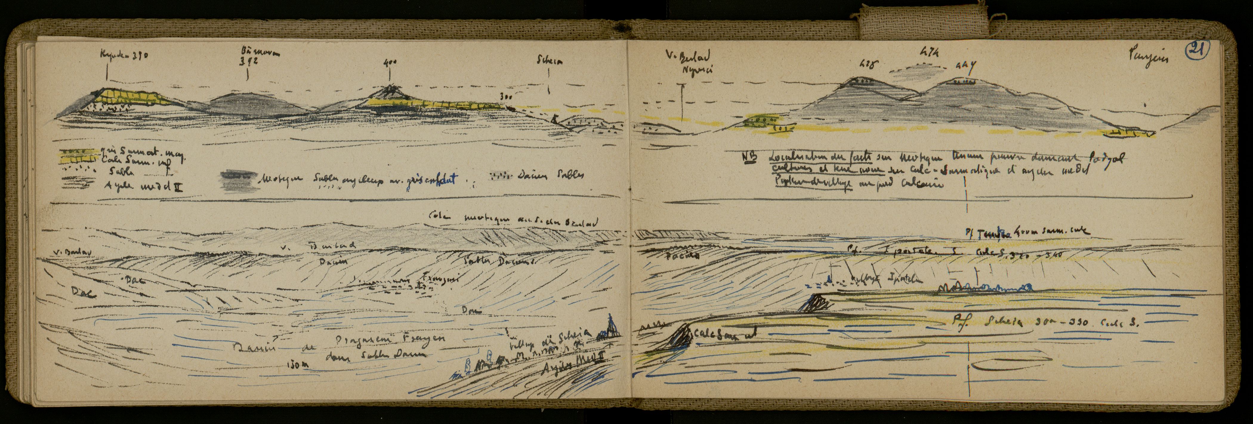 Pour expliquer les formes du relief, E. de Martonne cherche à repérer des surfaces d’érosion dans le paysage en comparant les altitudes des sommets, en combinant l’analyse visuelle du paysage et le contenu de la carte géologique. Les pages de ses carnets sont donc truffées de « pf » pour « plateforme d’érosion » ou « surface d’érosion ». L’un des objectifs est de repérer s’il y a une ou plusieurs surfaces d’érosion. Les surfaces d’érosion sont à mettre en lien avec la théorie du cycle d’érosion développée par l’Américain William Morris Davis et qui suscite de nombreux débats parmi la communauté internationale des géographes. Bien que sceptique au début, E. de Martonne semble s’y rallier tout en veillant à ne pas négliger les apports empiriques. Repérer, dater, analyser les surfaces d’érosion aident les géographes de l’époque à expliquer les processus érosifs et les formes du relief.