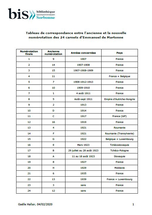 La numérotation définitive des carnets a été adoptée à la fin de l’année 2019 lors de la finalisation d’une campagne de numérisation précédant la mise en ligne du corpus sur la bibliothèque numérique NuBIS. Elle suit l’ordre chronologique des carnets et va de 1 à 27. Les carnets numérisés sont repérés par leur numéro final. La table de correspondance reste utile pour suivre les publications sur les carnets d’Emmanuel de Martonne publiées jusqu’à l’hiver 2019.