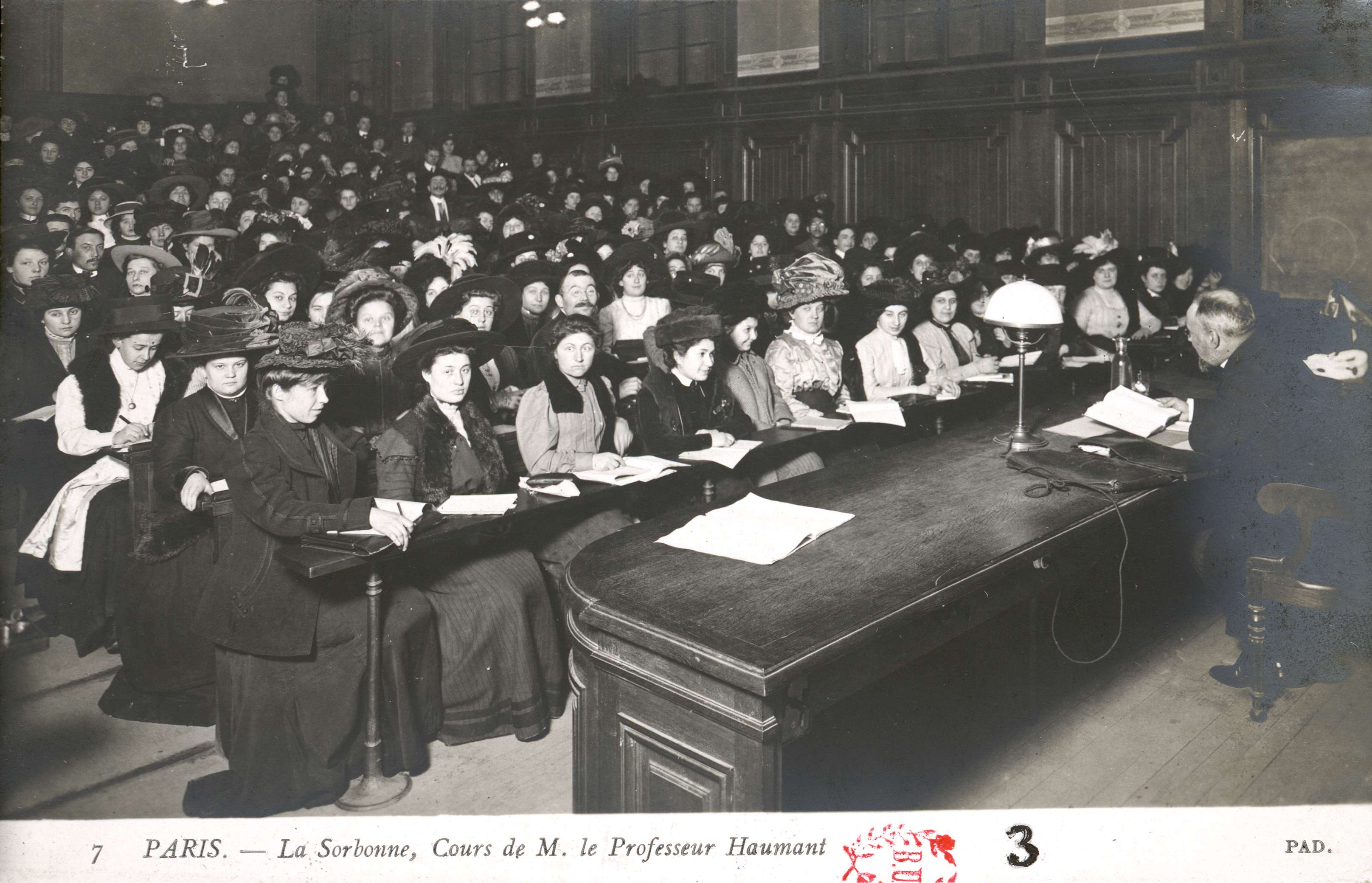 | La Sorbonne. Cours de M. le professeur Haumant. Carte postale, vers 1909. |