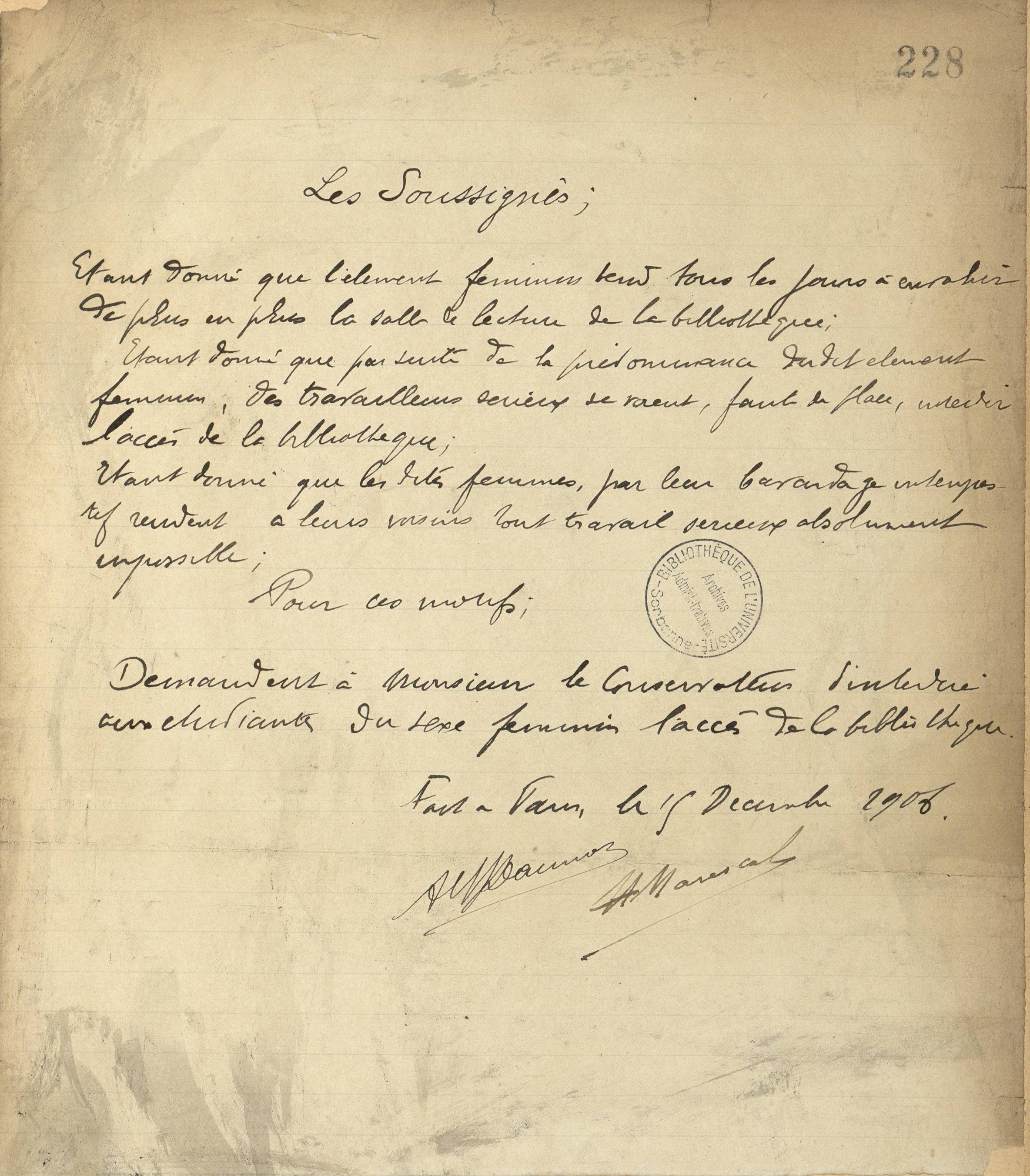 Demandent à monsieur le Conservateur d'interdire aux étudiants du sexe féminin l'accès de la bibliothèque. »Lettre de protestation dénonçant le bavardage des femmes dans la bibliothèque, 15 décembre 1906. Archives administratives de la bibliothèque de la Sorbonne.