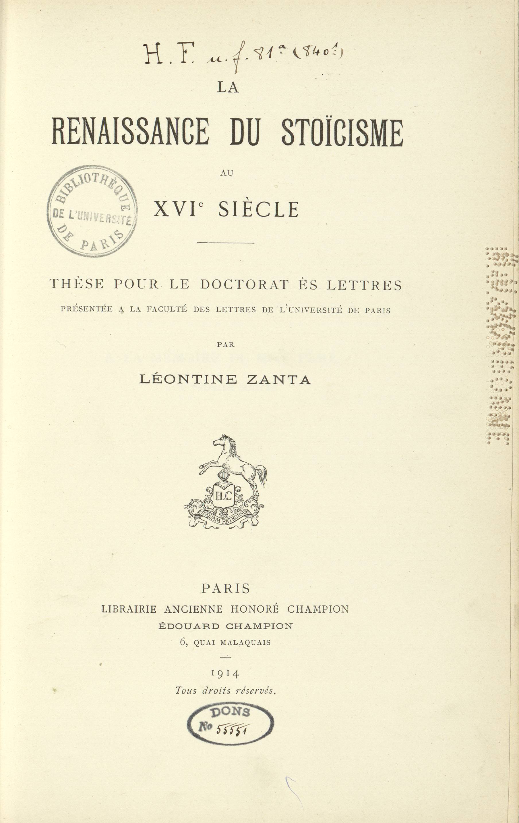 Quarante années passent avant que Jeanne Duportal et Léontine Zanta soutiennent chacune leur thèse la même année, la première sur les livres à figures édités en France de 1601 et 1660, la seconde sur La renaissance du stoïcisme au XVIe siècle.