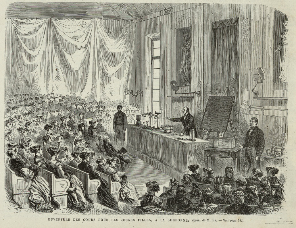 Créés en 1867 par Victor Duruy, les premiers cours secondaires à destination des jeunes filles rencontrent l’opposition farouche des milieux cléricaux et ne survivent pas à la chute du Second Empire.
