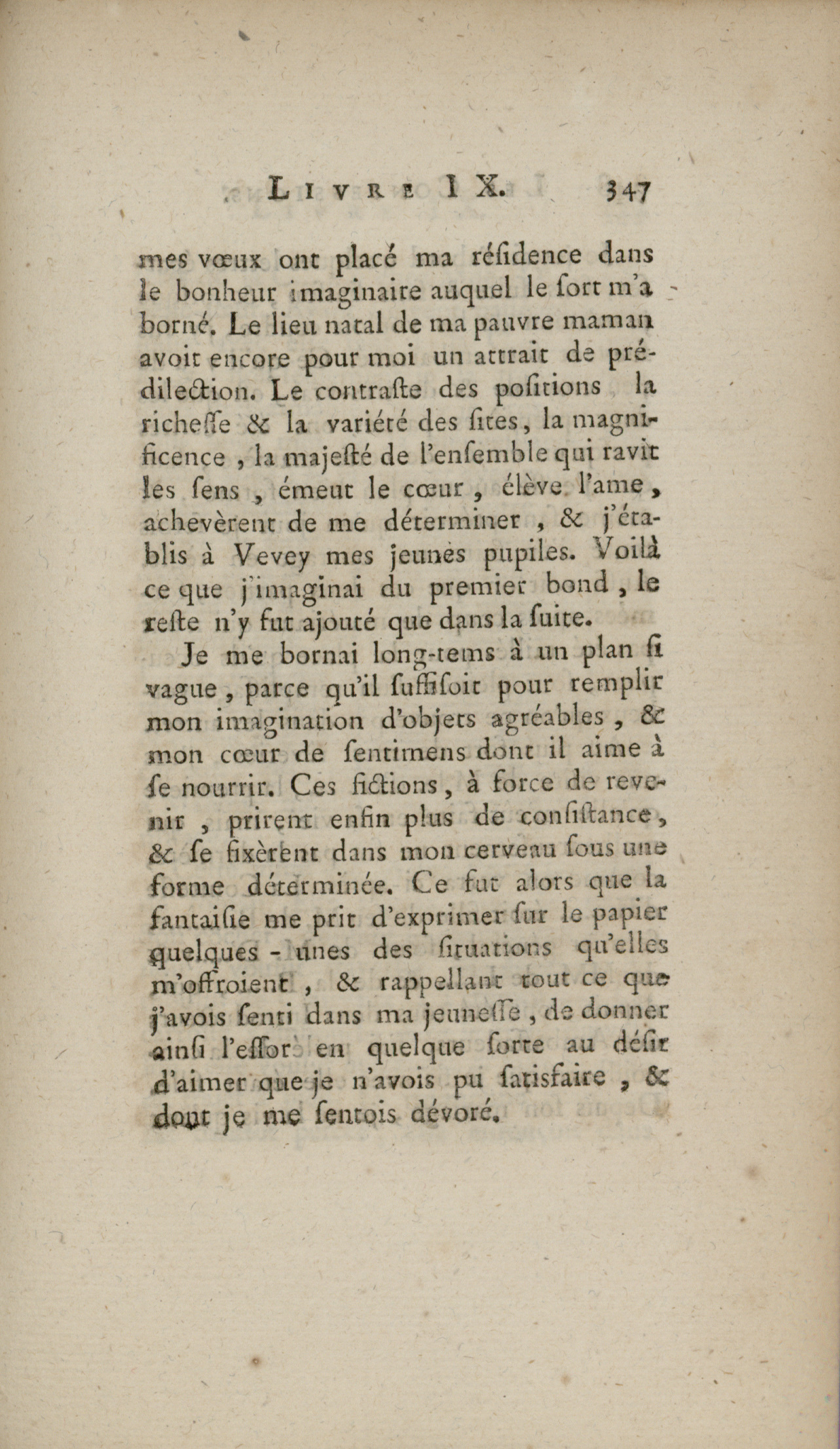 Extrait de : Lettres de deux amans, habitans d'une petite ville au pied des Alpes. Recueillies et publiées par J.-J. Rousseau, tome troisiéme, sixiéme partie. Amsterdam : Marc Michel Rey, 1761. (BIS, fonds Victor-Cousin, VCM 6= 9446, p. 348)