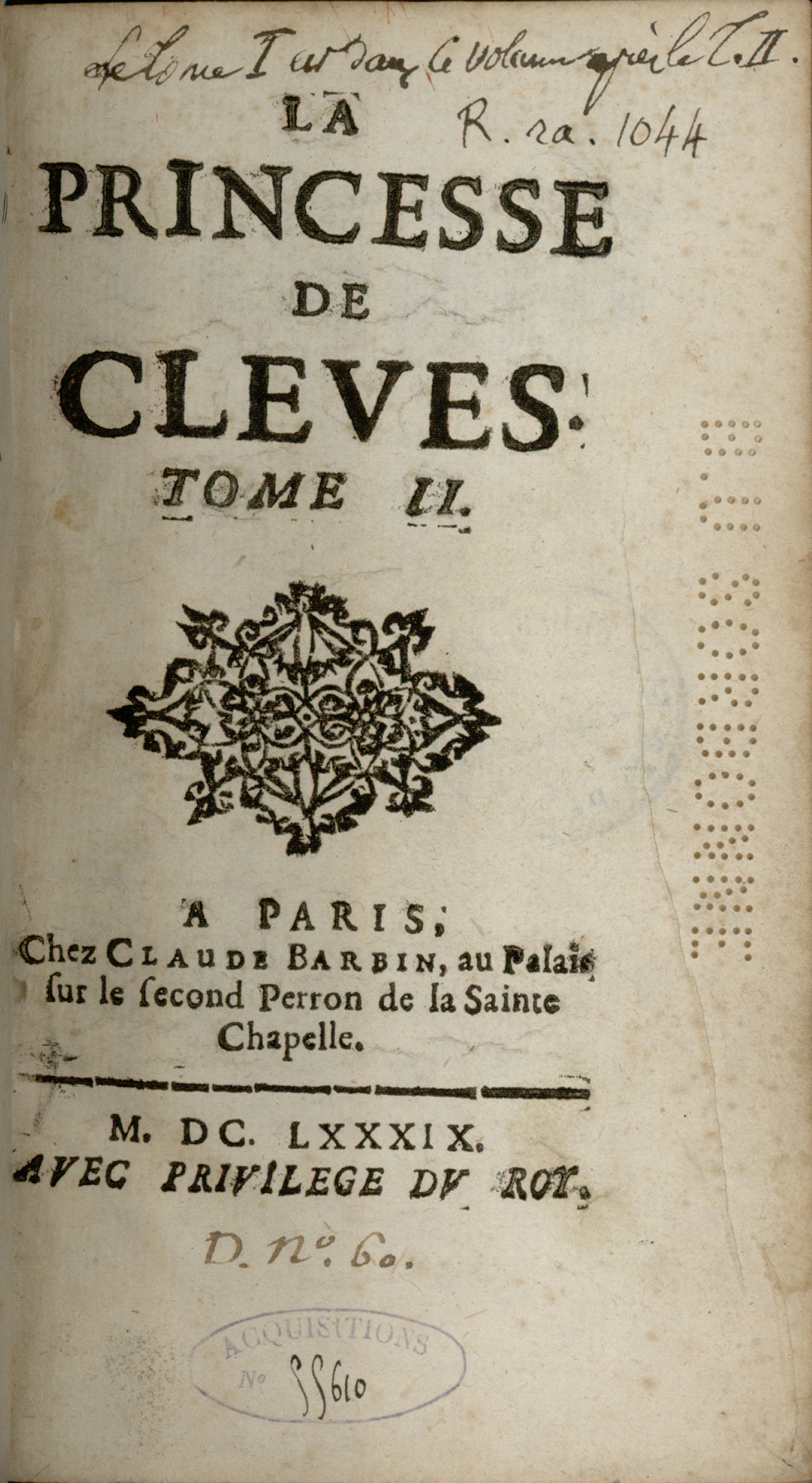 Madame de La Fayette. La Princesse de Cleves. Tome I.[-II.]. Paris : Claude Barbin, 1689. Deuxième édition, parue avant la mort de l'auteur, différente du premier tirage de l'édition originale de 1678. (BIS, RRA 6= 1044-2).