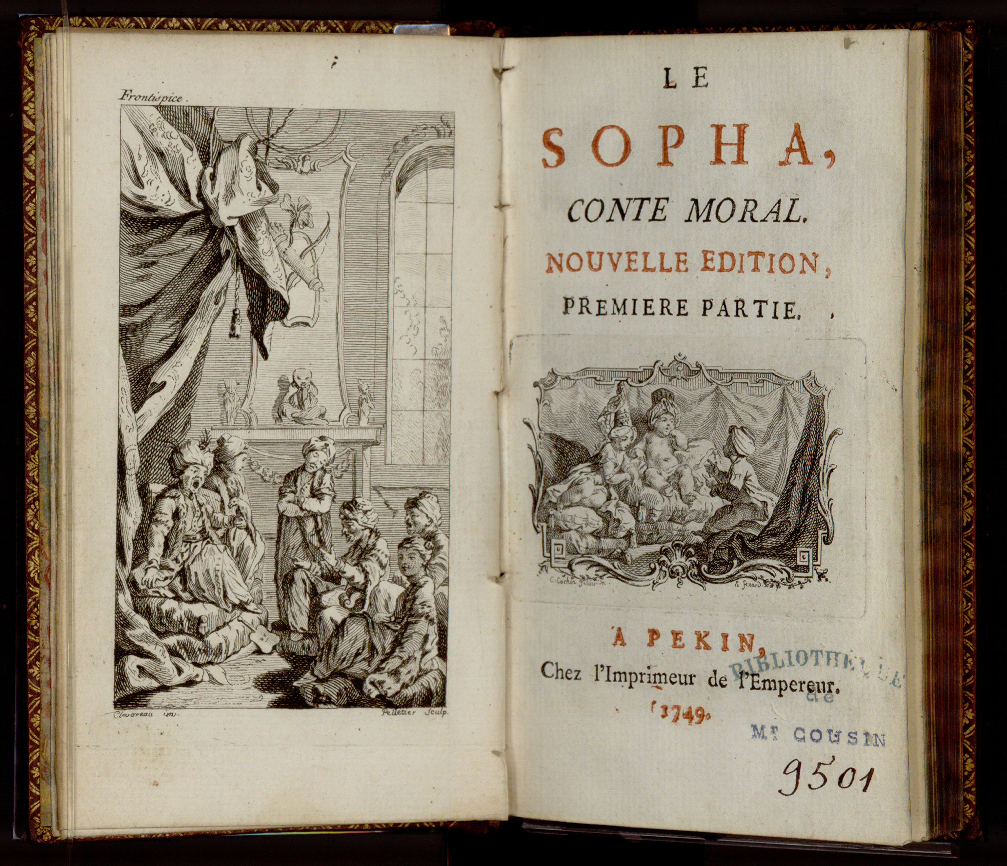 Claude-Prosper Jolyot de Crébillon. Le sopha, conte moral. Nouvelle edition, premiere partie. 1749. Vignette au titre des tomes I et II, gravée par Étienne Fessard d’après le dessin de Charles-Nicolas Cochin. C’est sans doute en 1737 que Crébillon rédige Le Sopha dont une première édition à très petit tirage paraît en mars-avril 1739 sous le titre Le Sopha couleur de roze. Premier d’une série de romans « à transformations » qui verront plus d’un narrateur se métamorphoser en sièges divers permettant « d’entrer dans les lieux les plus secrets, et d’être en tiers dans les choses que l’on croirait les plus cachées » selon les termes de Crébillon, Le Sopha peut être considéré comme l’un des emblèmes du « roman libertin » contre lequel s’écrit La Nouvelle Héloïse. (BIS, fonds Victor Cousin, VCM 6= 9501).