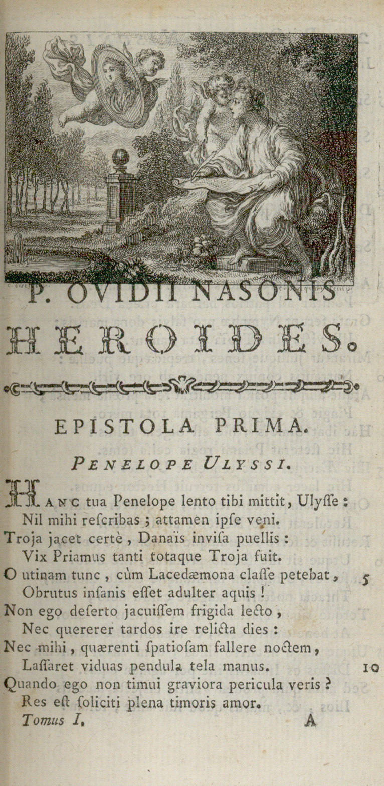 P. Ovidii Nasonis opera quæ supersunt. Paris : Joseph-Gérard Barbou, 1762. Précédé du faux-titre P. Ovidii Nasonis erotica, le tome 1 de cette édition contient les Héroïdes (p.1-116). Le début du texte est surmonté d'une vignette gravée par Charles Baquoy d'après Charles Eisen. (BIS, RXVIII 6= 34-1).