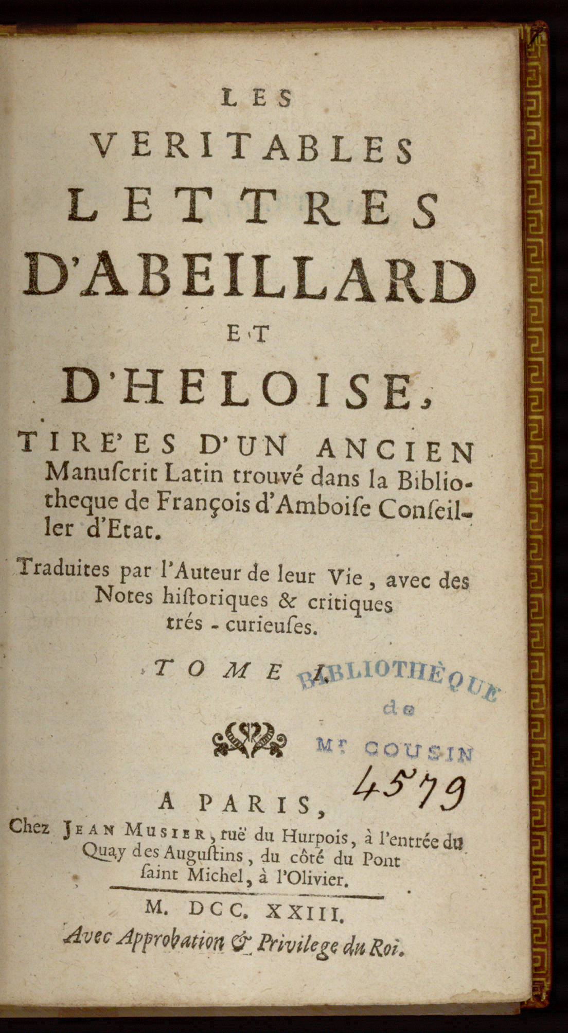 Les veritables lettres d'Abeillard et d'Heloise, tirées d'un ancien manuscrit latin trouvé dans la bibliotheque de François d'Amboise conseiller d'Etat... Tome I. Paris : Jean Musier, 1723. (BIS, fonds Victor Cousin, VCM6= 4579).