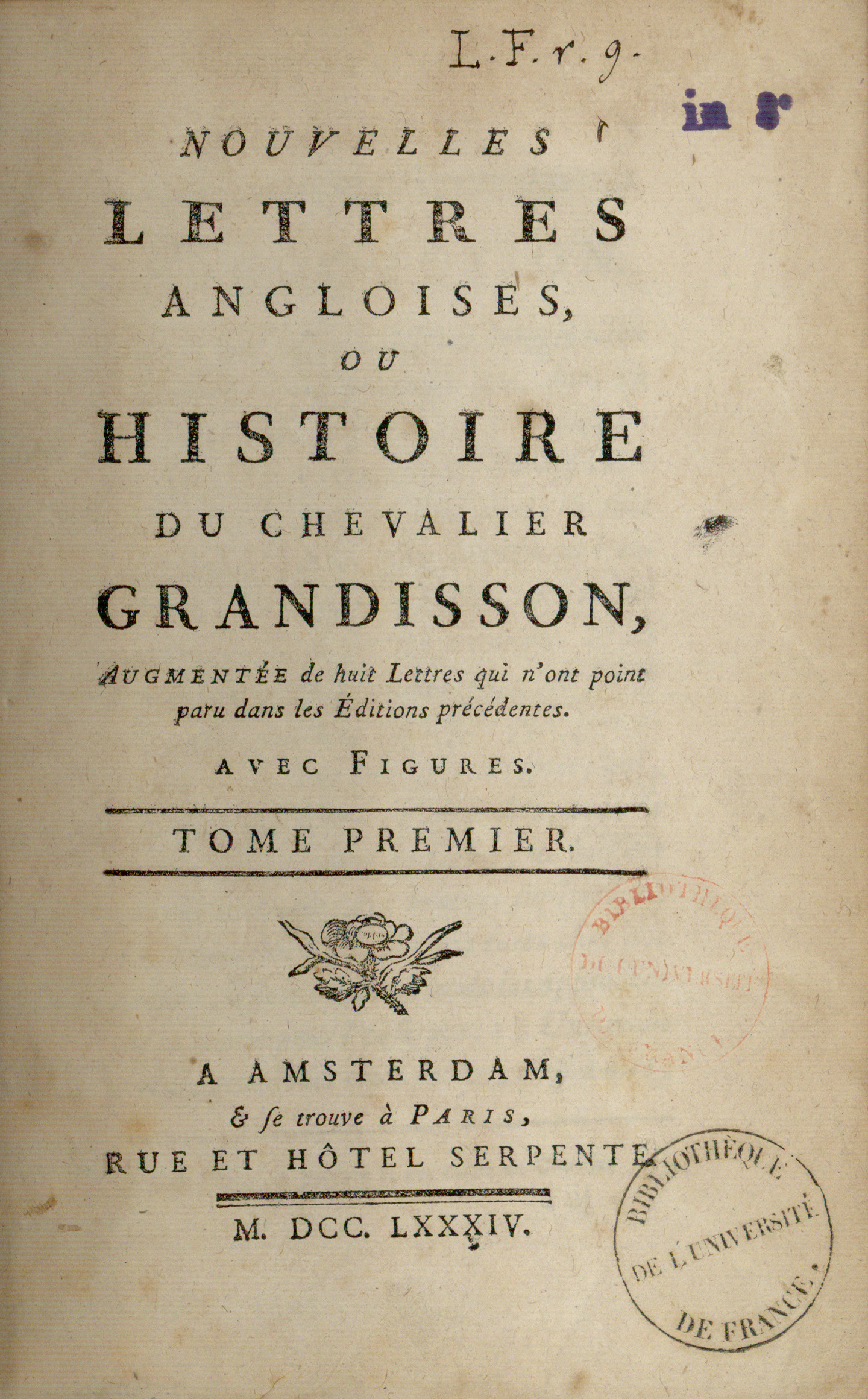 Samuel Richardson. Nouvelles lettres angloises, ou Histoire du chevalier Grandisson, augmentée de huit lettres qui n'ont point paru dans les éditions précédentes. Avec figures. Tome premier. Amsterdam et Paris, 1784. Traduction par l'abbé Prévost. (BIS, LFR 8= 9-25).