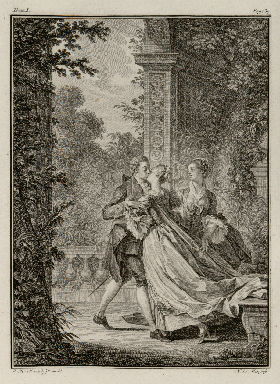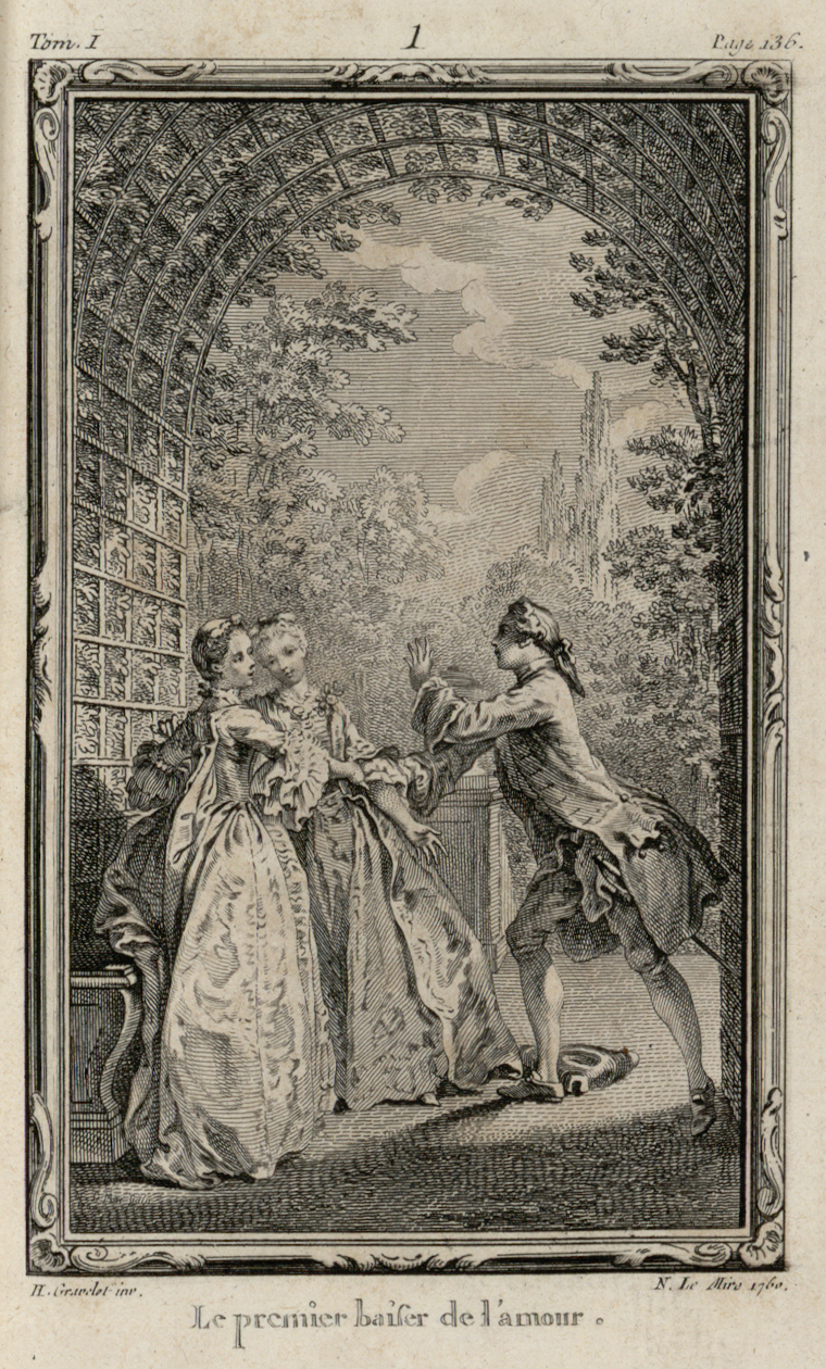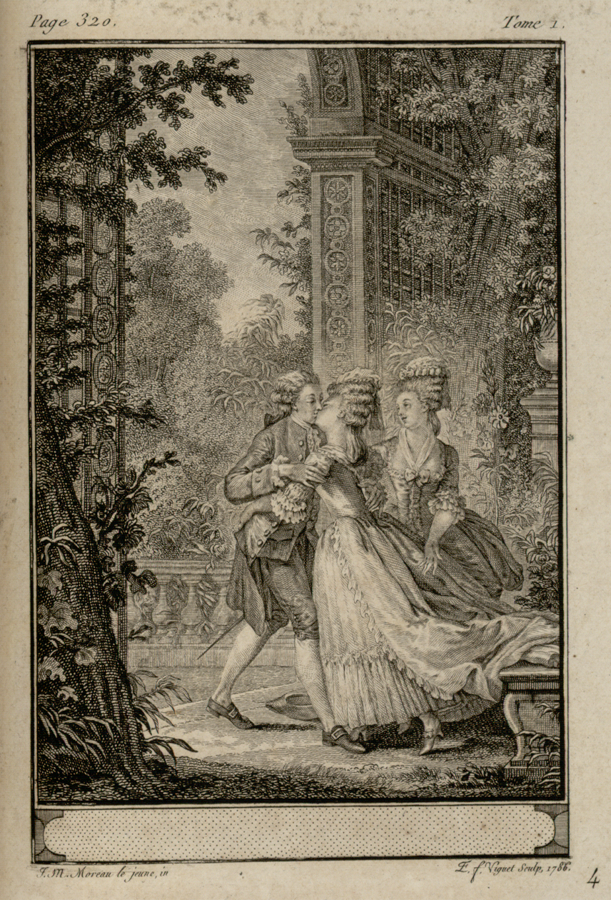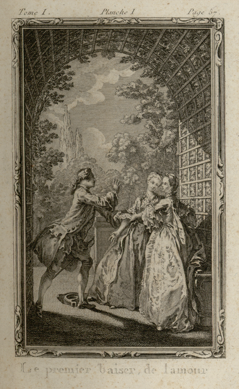 En 1774, Moreau le Jeune donne sans doute l’illustration la plus célèbre de la scène du premier baiser en choisissant le moment de l’étreinte et non l’instant qui lui succède. Du dessin originel de Gravelot, Jean-Michel Moreau conserve certes le décor avec le berceau treillagé, le banc et l’urne, les personnages en habits de cour, ainsi que le chapeau à terre. Mais le dessin s’efforce de suggérer l’intensité amoureuse de la scène en s’affranchissant des injonctions de Rousseau. La composition de Moreau le Jeune eut un succès tel qu’elle fut souvent réutilisée. Les gravures de Le Mire d’après Moreau le Jeune ont ainsi été insérées dans certains exemplaires de l’édition de La Nouvelle Héloïse qui figure dans la Collection complète des œuvres de Jean-Jacques Rousseau publiée sous l’égide de la Société typographique de Genève à partir de 1782.