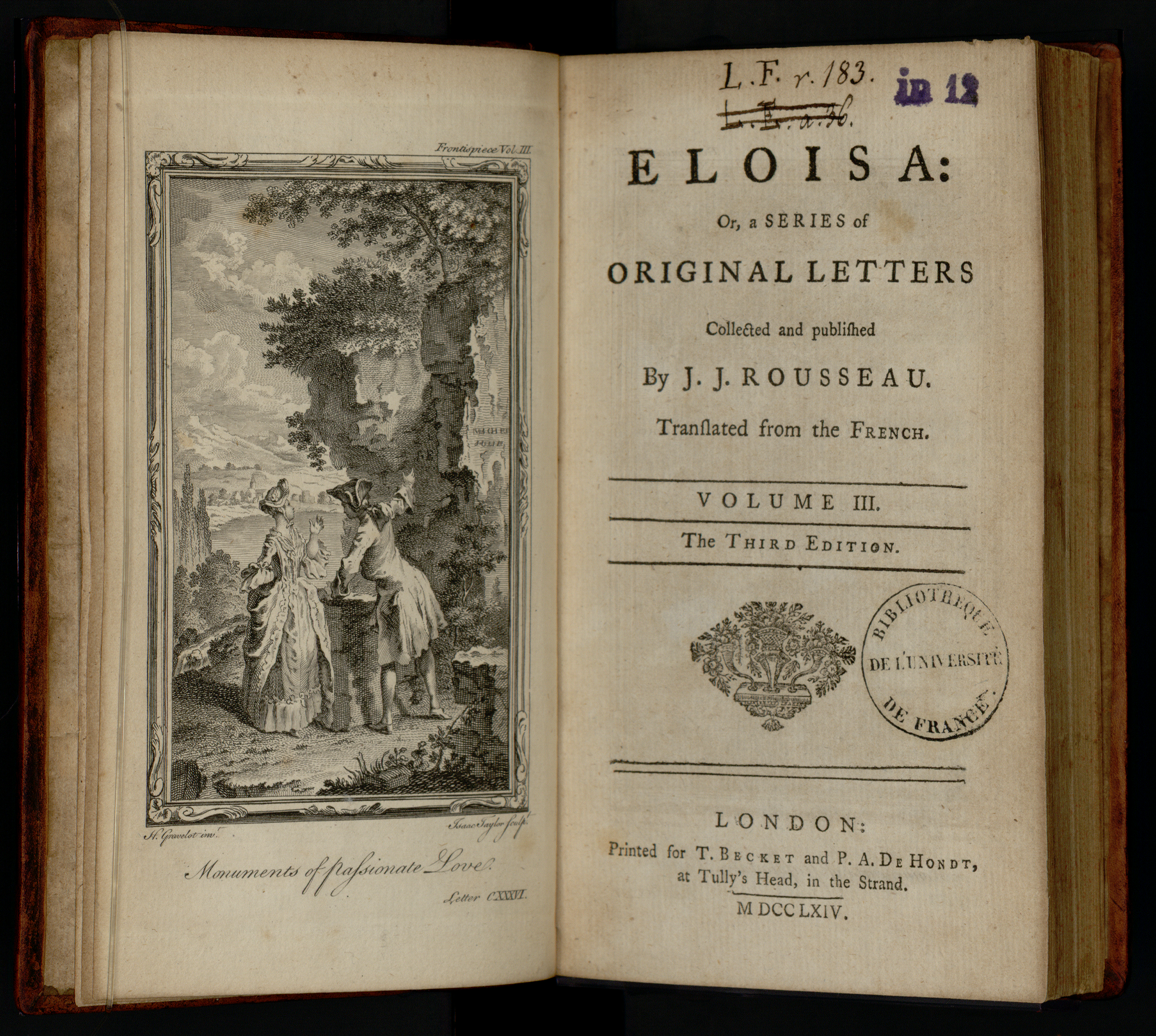 Eloisa: or, a series of original letters collected and published by J. J. Rousseau. Translated from the French. Volume III. The third edition. London: T. Becket and P. A. De Hondt, 1764. (BIS, LFR 6= 183-3).