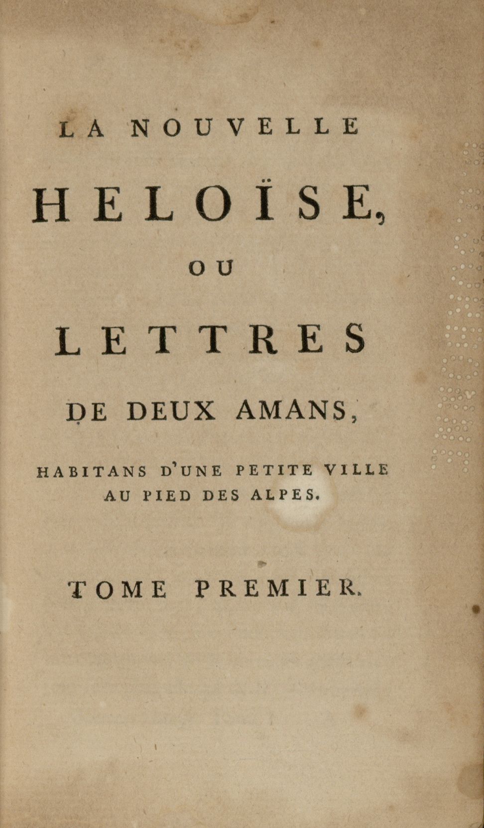 Collection complète des œuvres de J. J. Rousseau. [Kehl] : imprimerie de la société typographique, 1783-1789. 34 vol. Au tome III : La Nouvelle Héloïse ou Lettres des deux amans, habitans d’une petite ville au pied des Alpes. Tome premier. (BIS, LFPI 6= 28-3).