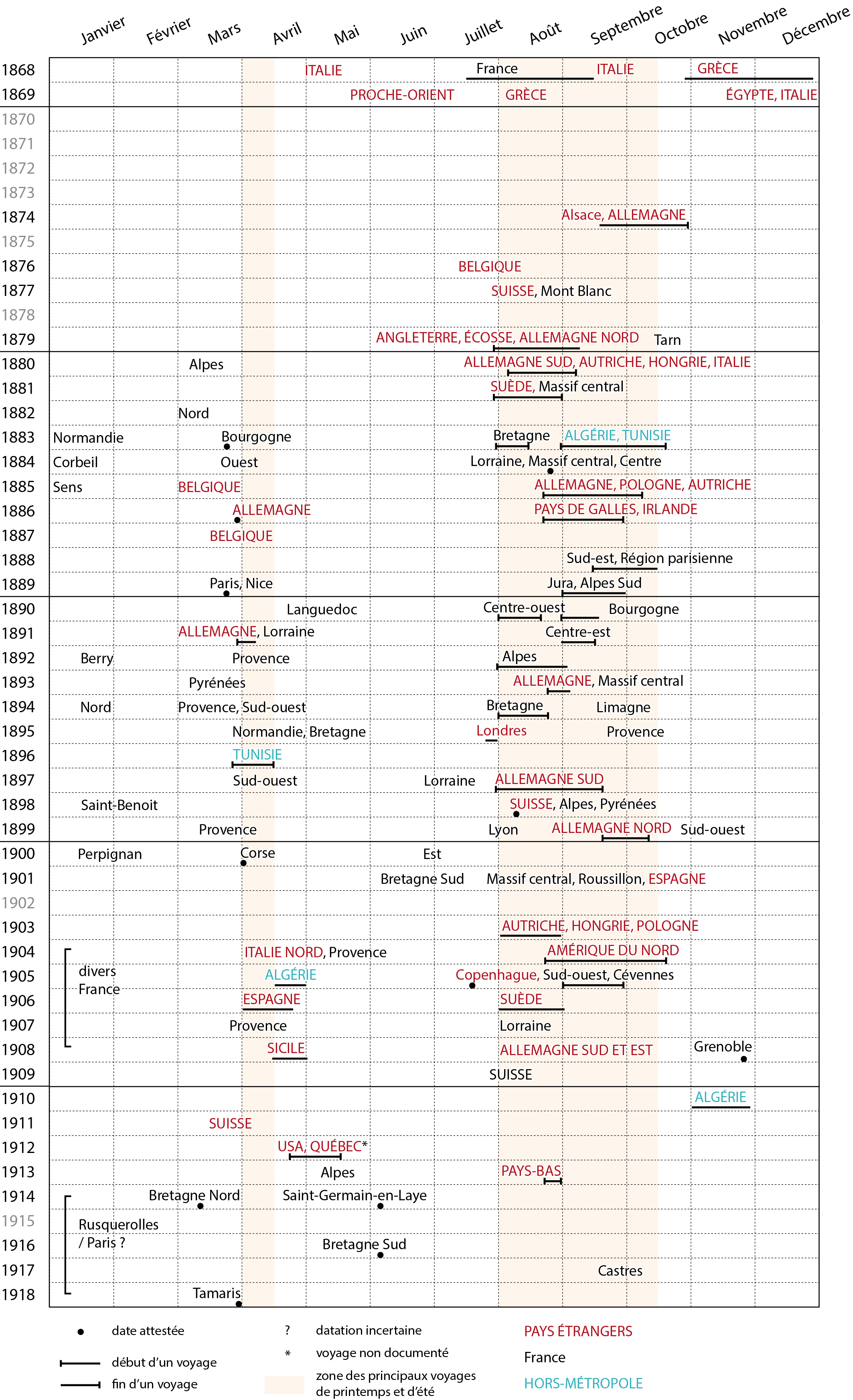 Ces carnets ont accompagné Vidal dans ses périples d’Athénien comme dans les longs voyages et dans les sorties hebdomadaires qu’il allait accomplir une fois son programme de géographe amorcé, au début de sa carrière universitaire à Nancy (1872). Un calendrier de ses déplacements montre la régularité de ses excursions tout au long de sa vie active, rythmée par le « temps des cours » et celui des vacances : le « temps des courses ».